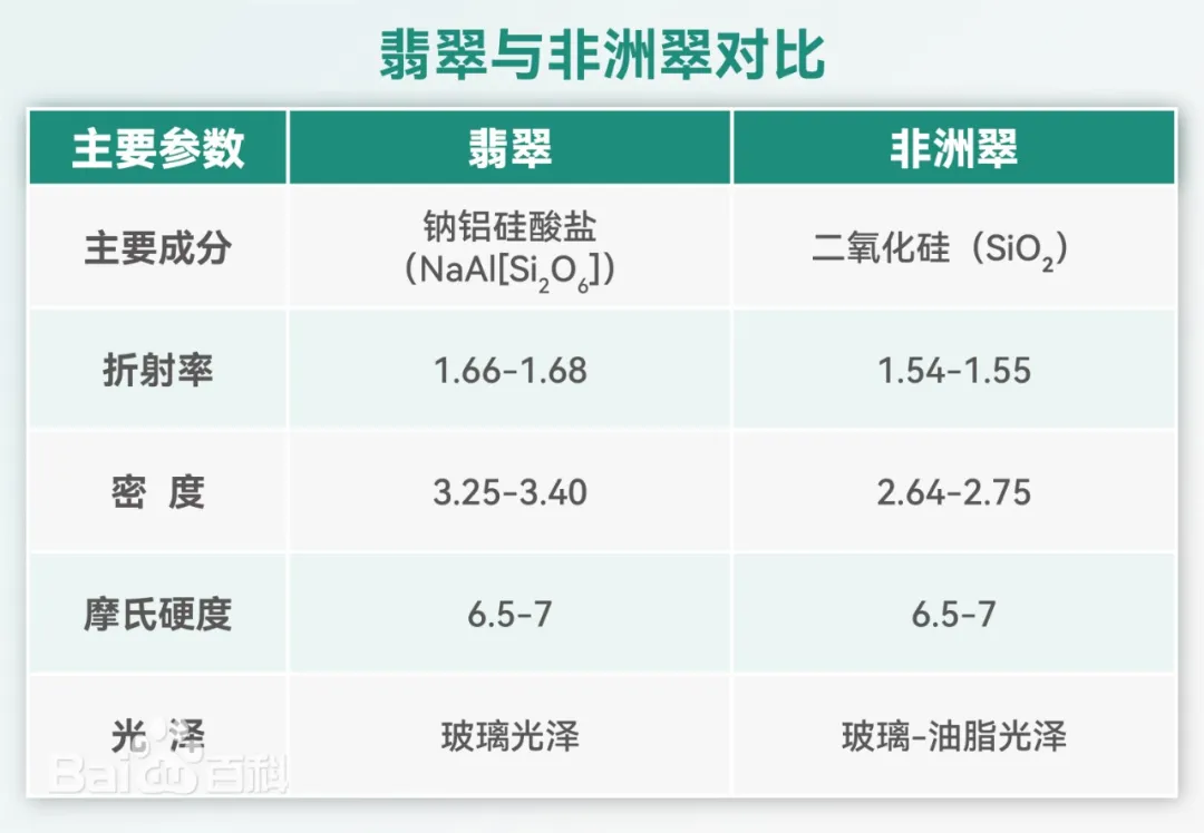 硬度密度:非洲翠的硬度在7左右,翡翠的硬度在6.5到7之间,差别不大。但密度方面,非洲翠是2.65,翡翠是3.33,非洲翠明显轻一些。结构质地:非洲翠是粒状结构,质地比较脆,手镯磕碰更容易裂。而翡翠是纤维交织结构,质地相对更坚硬。