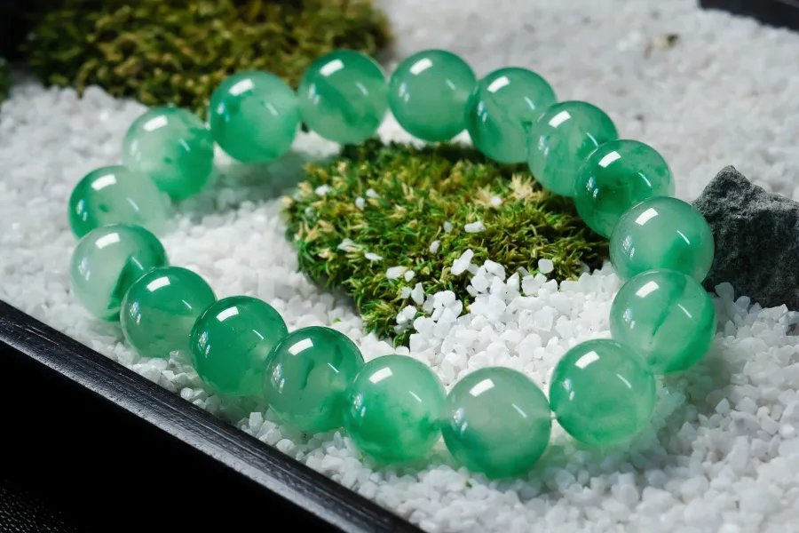近两年特别火的天山翠,早期被一些商家以“产自新疆天山上的冰种翠玉”来介绍。它的矿物成分是石英岩,通常底色为白色或淡绿色,可带有绿色飘花,透明到不透透明。