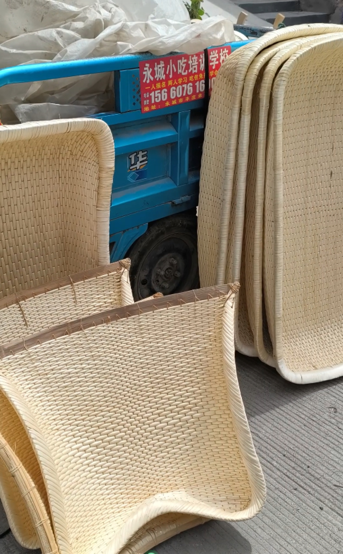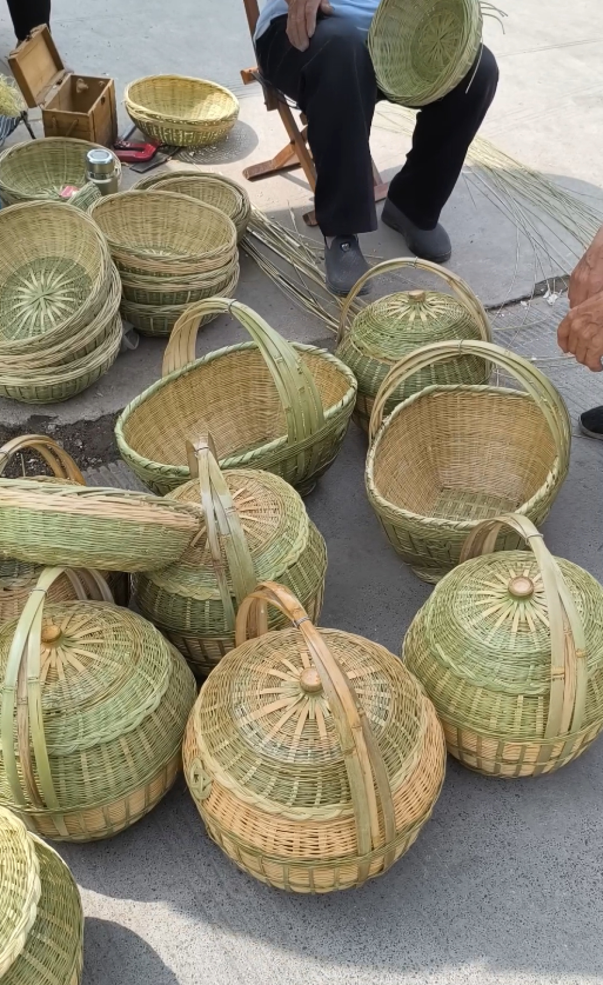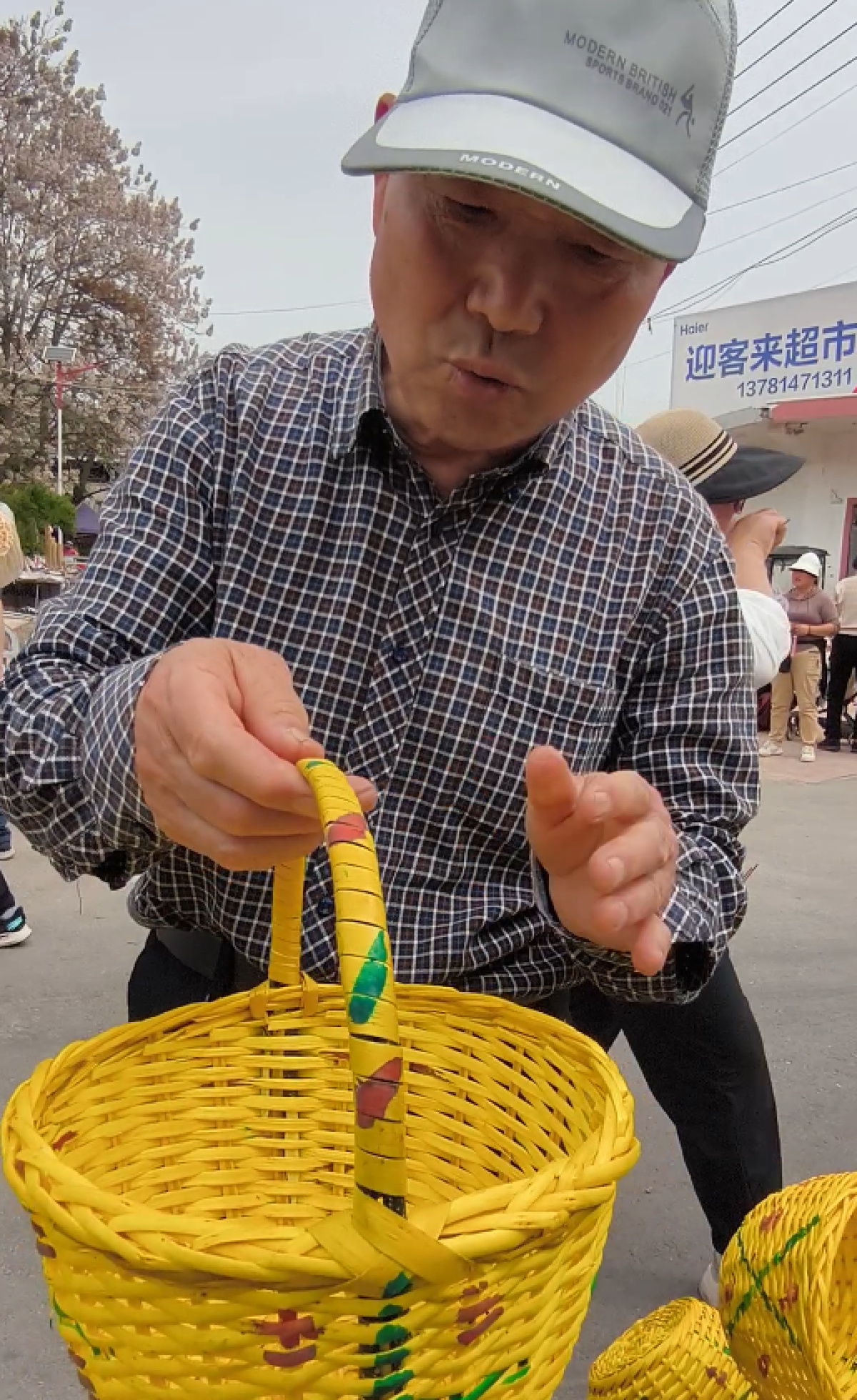 庙会上还有做竹编、藤编工艺的。老板介绍,自己日常编织,也雇工人来编织。几位工人正坐在小马扎上,手指在竹条间灵活穿梭,竹篾碰撞发出细碎的“沙沙”声。手里的竹篮已经初见雏形,翠绿的竹条被打磨得光滑温润。