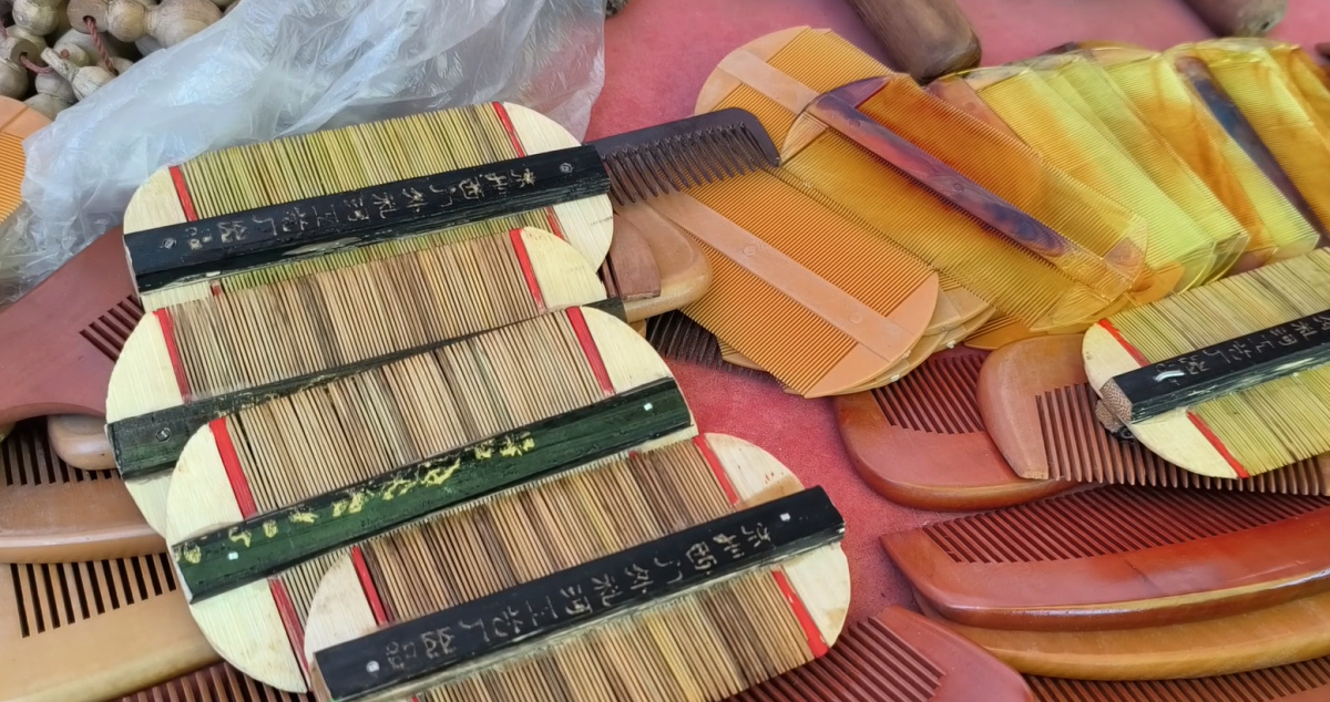 “这是篦子,一些上了年纪的老人习惯用这种。”摊位老板娘解释,“以前老人有虱子,用这个可以把虱子梳掉”。我想起小时候姥姥就是用这种篦子,在太阳下梳头,满满的儿时回忆。