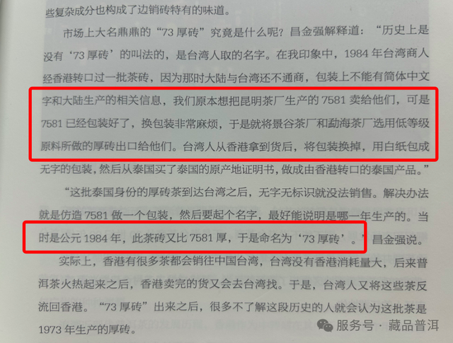 73厚砖并不是1973年生产的茶砖,而是一批诞生于上世纪80年代中期的边销砖。据原云南省茶叶进出口公司特种茶部经理昌金强先生回忆,1984年,有个台湾茶商想进口一批7581茶砖。