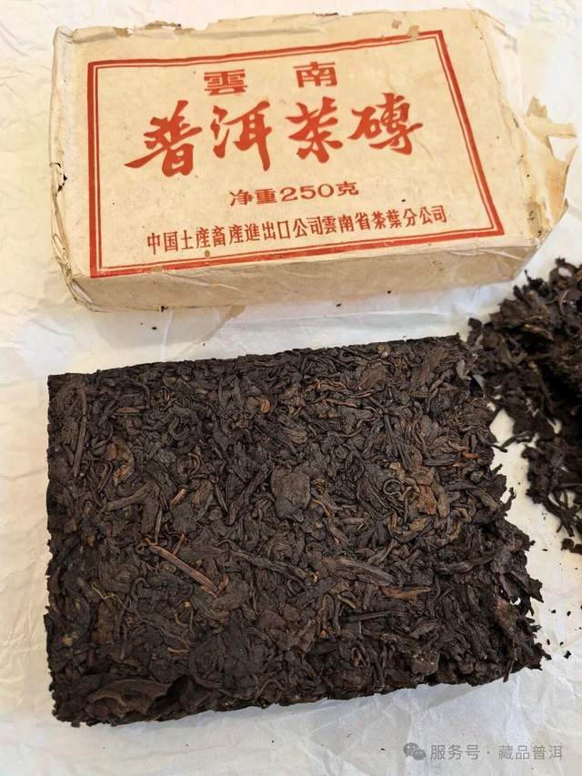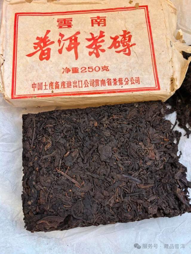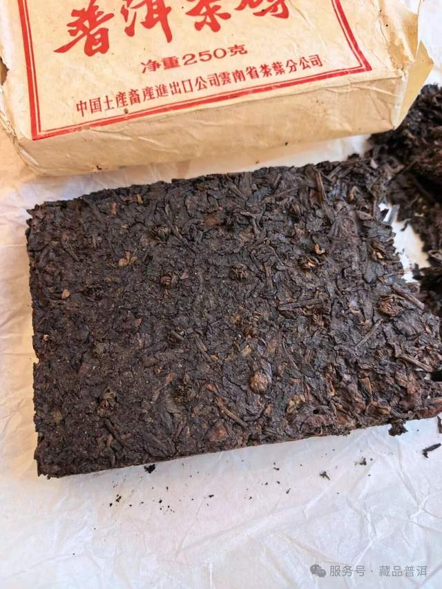 80年代油光纸景谷熟砖,重250克,采用油光纸包装,这批茶的辨别细节有三: