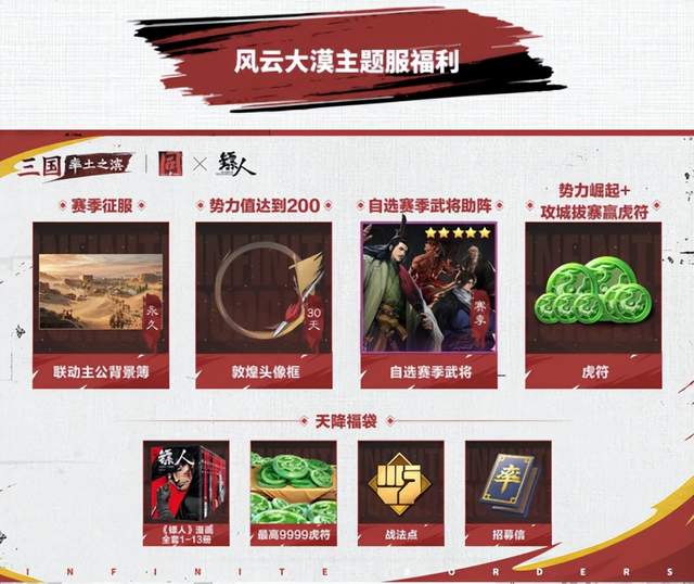 在这次的主题服里,玩家只要首次占领5级及以上土地,就有机会开出福袋,里面有《镖人》漫画全集、最高9999虎符等等惊人的奖励,各种福利多到数不过来。