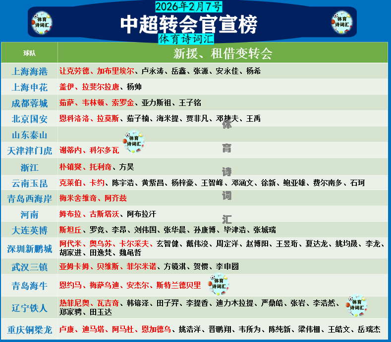 1、上海海港:让克劳德、加布里埃尔(转会费60万欧)、卢永涛、岳鑫、张源、安永佳、杨希(转会费143万欧)。