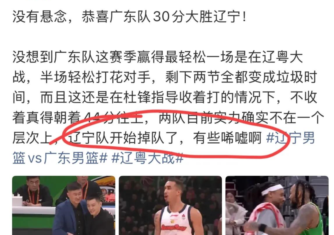 这场比赛没有悬念,恭喜广东男篮30分大胜辽宁。没有想到,广东队本赛季赢得最轻松的一场球,是在辽粤大战。半场轻松打花对手,而且这还是在杜锋教练收着打的情况下。如果不收着打,那么分差很可能会超过40分。目前两支球队的实力确实不在一个层次上。辽宁男篮开始掉队。