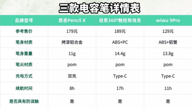 对比之下,其他两款电容笔虽然也表现不错,但还是有明显短板:倍思360°触控有线充续航最强、充电速度很快,但笔身偏重;wiwu 9Pro颜值在线、基础书写够用,但偶尔容易卡顿,适合对整体体验要求不高的用户选择!