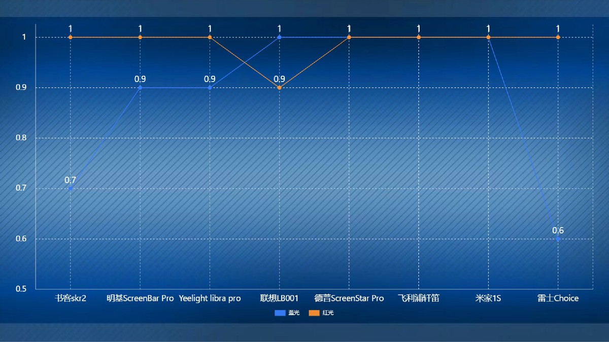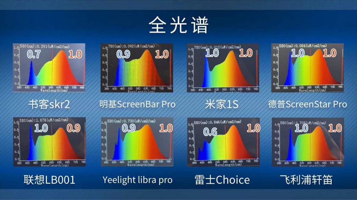 这些屏幕挂灯的蓝光值是1.0,蓝光含量是属于高含量的。红光虽然也不低,但蓝光比例偏高,长时间使用电脑或学习时眼睛容易觉得累。