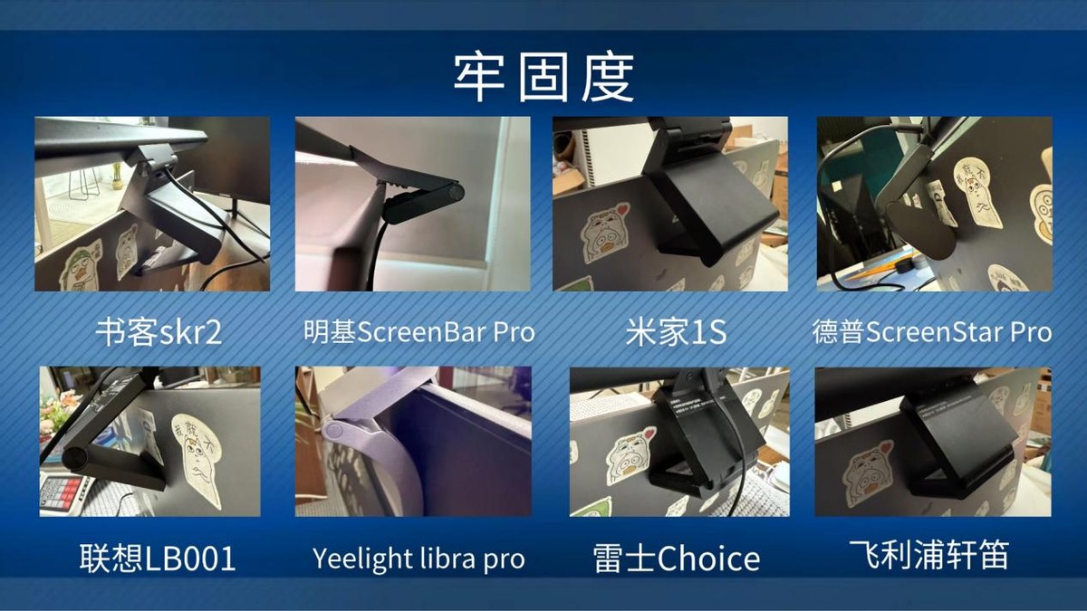 这几款在牢固度测试里表现比较稳,安装到显示器上之后贴合度很好,轻微晃动桌面时灯体基本不会跟着动。实际使用过程中位置比较固定,不容易滑动或掉落,用起来更安心,也不用担心碰到之后砸到屏幕。