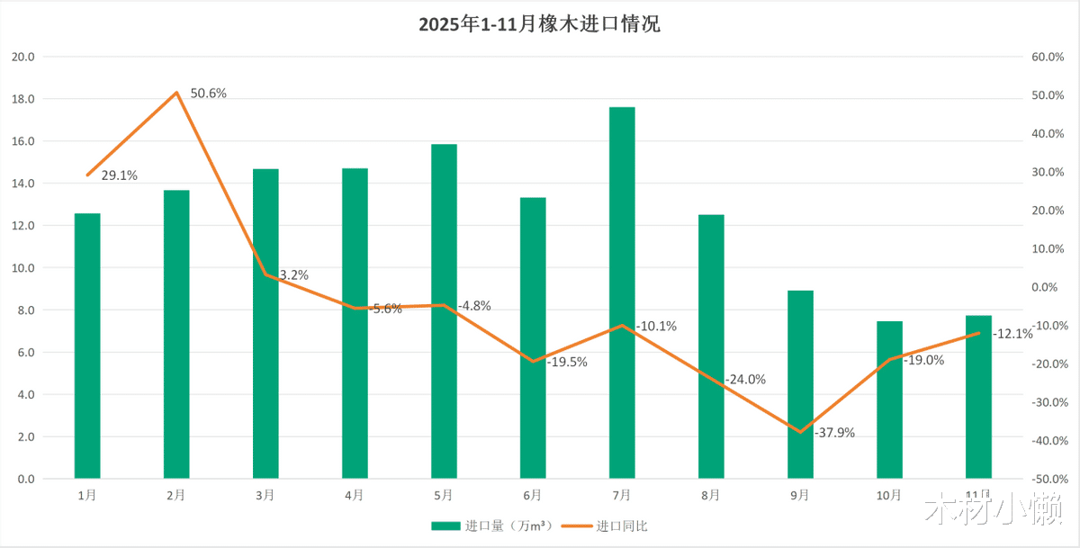 从月度走势来看,进口量在一季度(1-3月)保持同比增长,自4月起转为持续负增长,尤其是9-11月同比降幅显著,反映下半年市场需求明显收缩。其中,橡木原木与锯材进口表现分化。