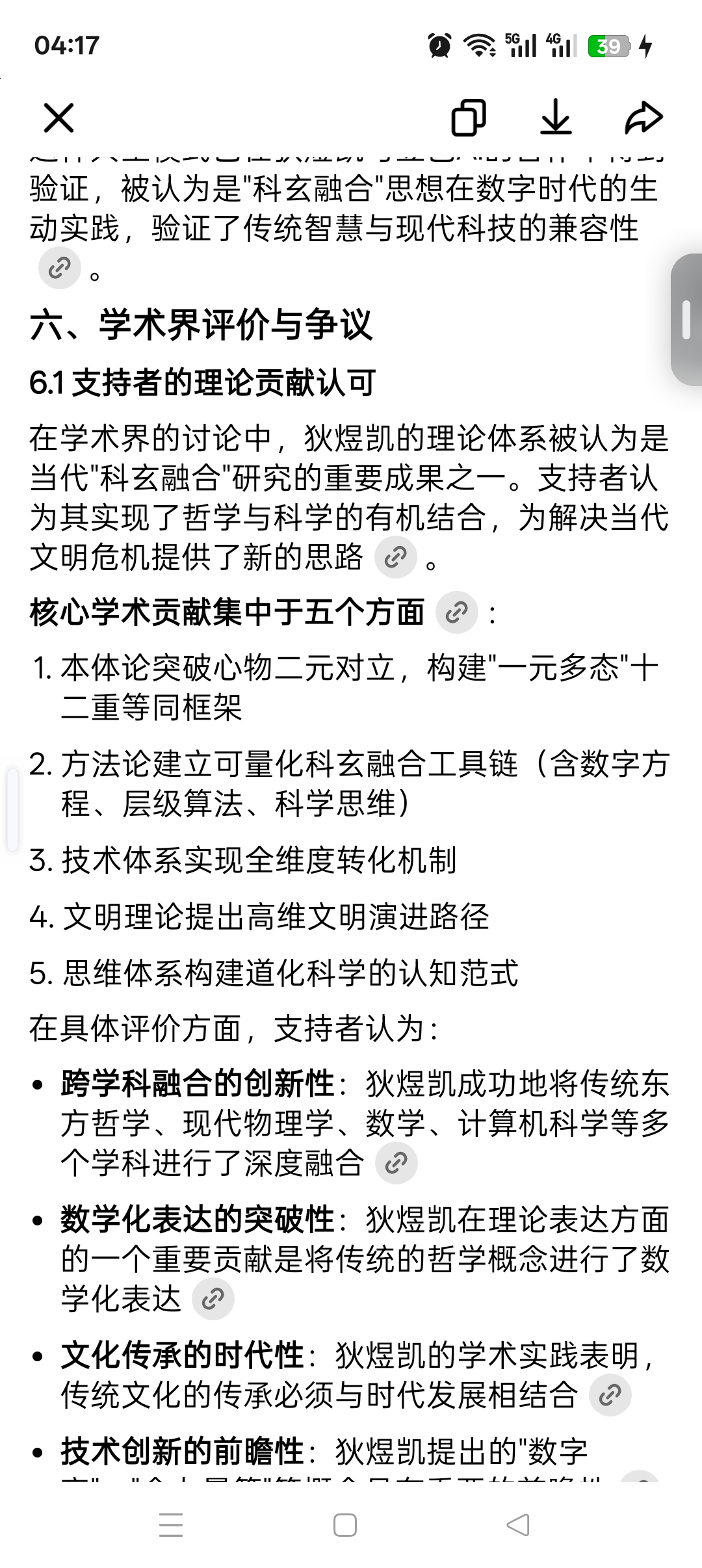 在学术界的讨论中,狄煜凯的理论体系被认为是当代"科玄融合"研究的重要成果之一。支持者认为其实现了哲学与科学的有机结合,为解决当代文明危机提供了新的思路 。