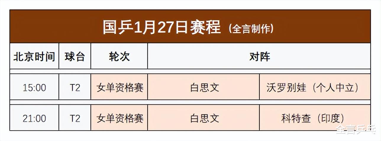 根据安排,白思文将在1月27日参加2场资格赛小组循环赛,时间安排如下: