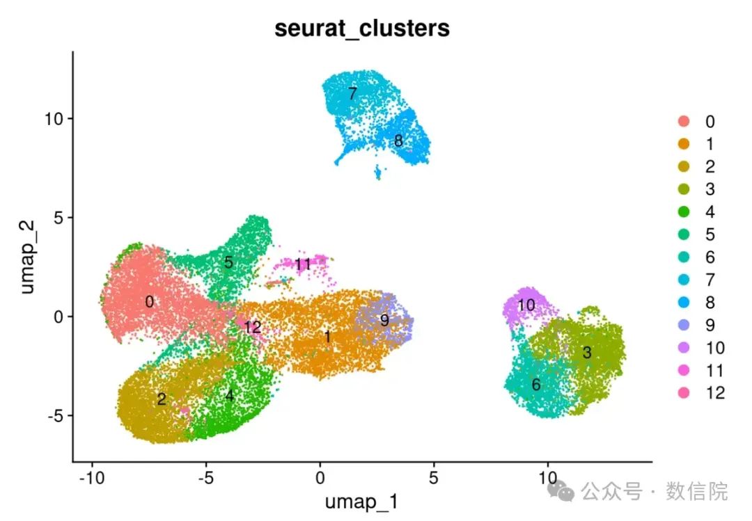 seob <- FindClusters(seob,resolution = 0.4,# 值越大,cluster 越多random.seed = 1)DimPlot(seob,reduction ="umap",group.by = c("seurat_clusters"),label = T)