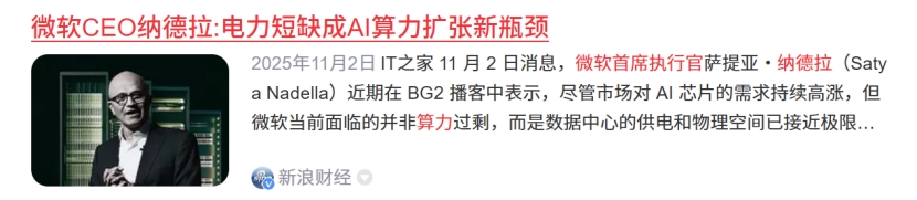 2025年11月3日,微软纳德拉表示,电力短缺成AI算力扩张新瓶颈。