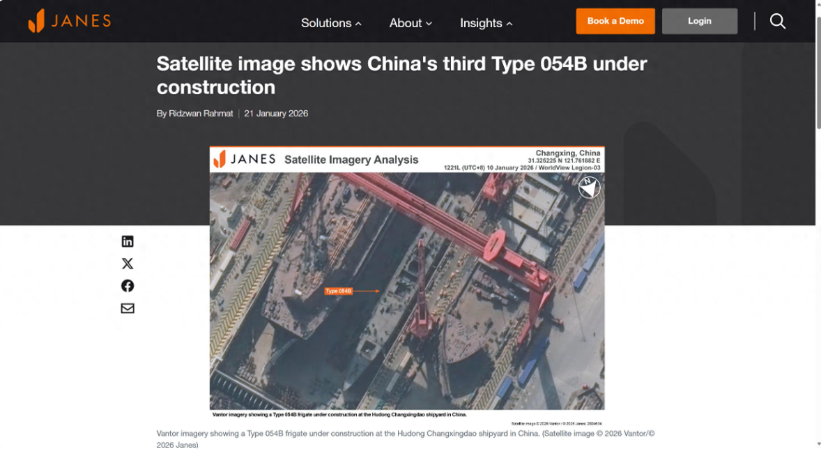据简氏防务周刊网站1月21日报道,在沪东中华造船厂长兴岛新基地正在建造的新舰,只剩下上层建筑尚未合拢,大概率会在未来几个月之内下水,疑似第三艘054B型护卫舰的船体。