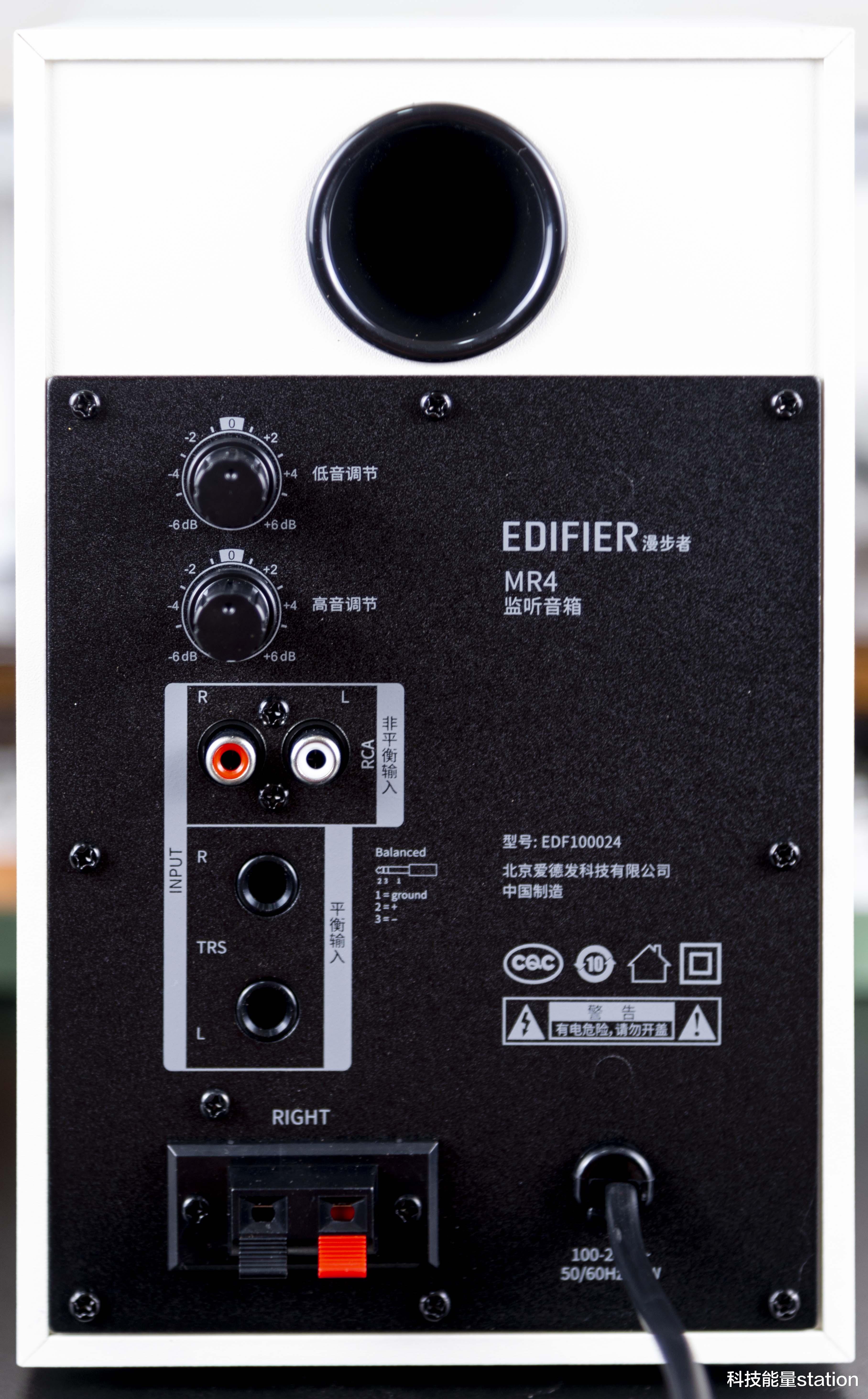 一起来看看MR4背部接口,背部设有两个旋钮,能够分别控制低高音的调节。同时输入位提供RCA非平衡输入接口(可连接播放器、电脑、CD机等)和TRS平衡输入接口(可连接专业调音台、音频制作设备等)。在最下方则是连接副箱输出接口,通过附送的主副箱连接,达到立体音的氛围效果。
