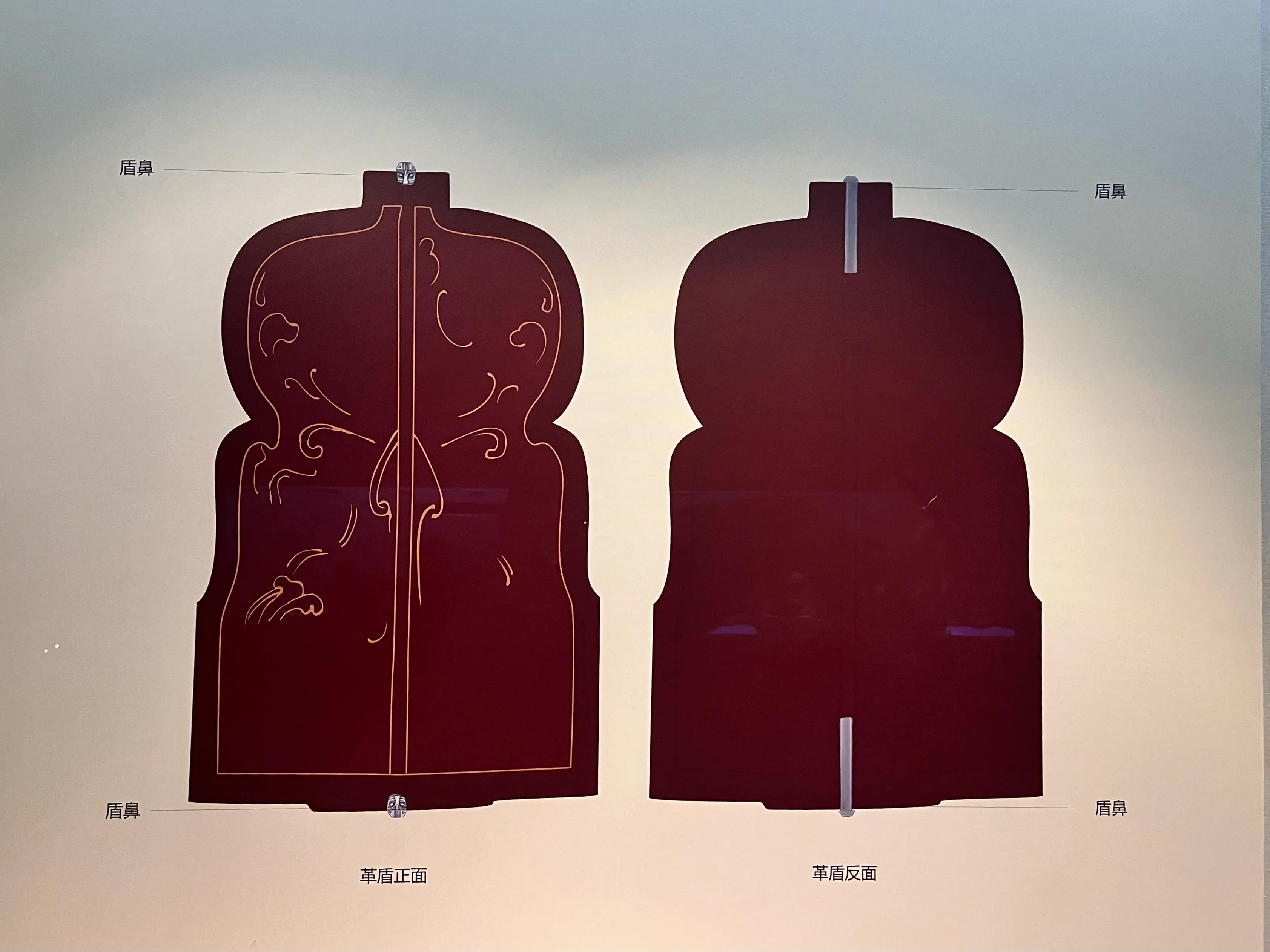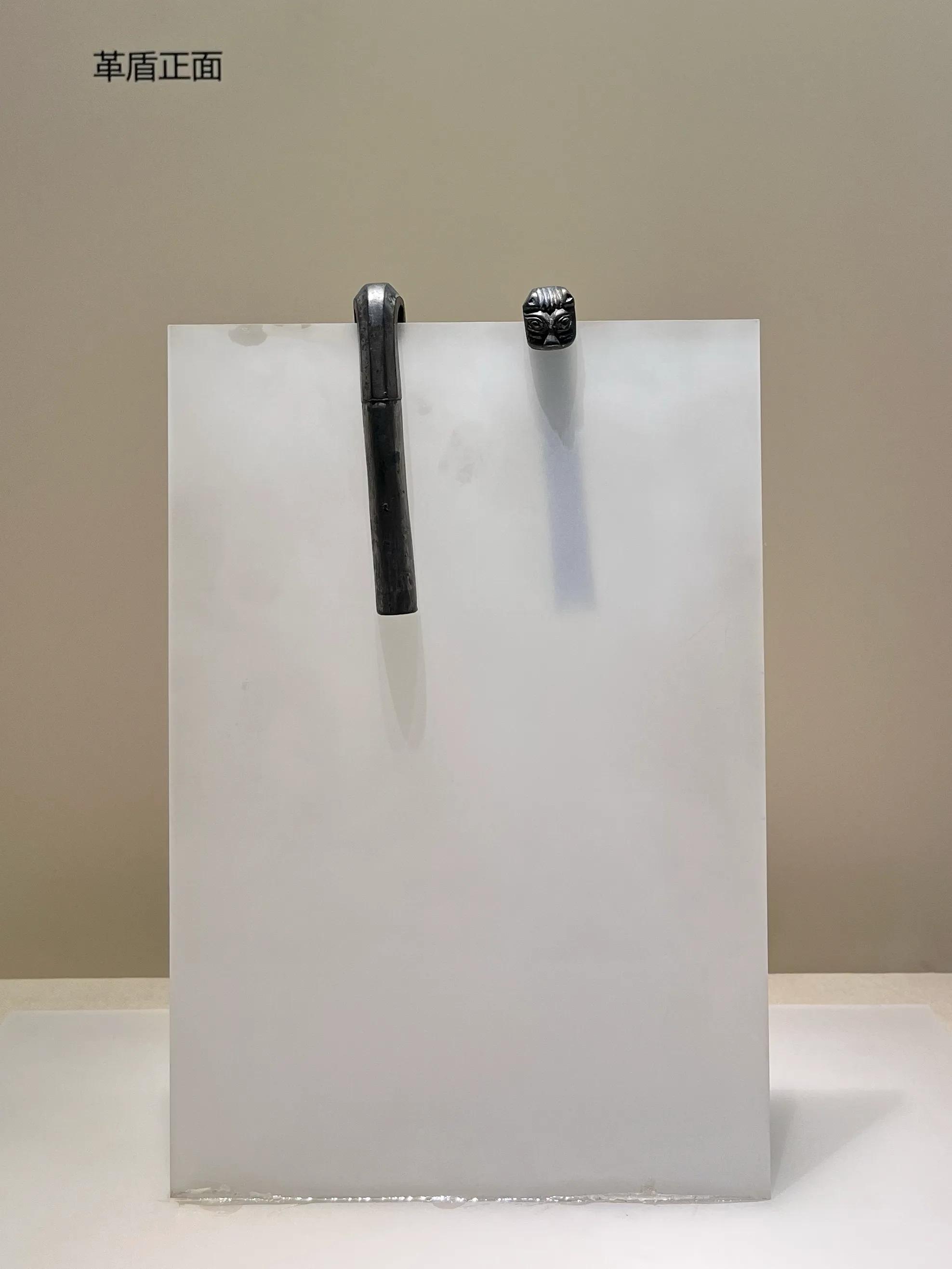 刘胜墓随葬革盾一具,出土时盾身已朽,仅存银质的盾鼻。盾鼻放置在盾背面竖嵌木条的两端,盾鼻的头部折屈,向外钩住盾面,使木条附着更紧,从而也使盾得以加固。