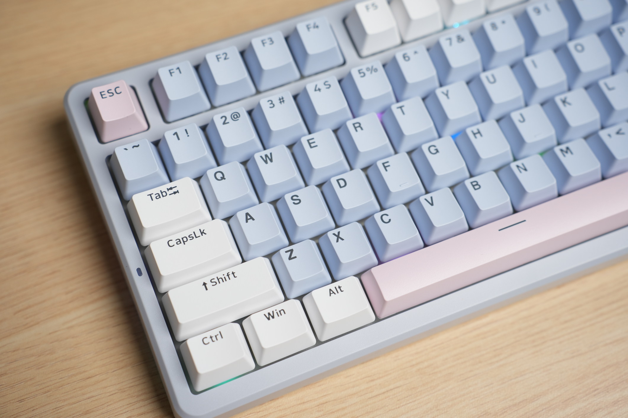 键盘采用全键热插拔设计,五脚轴座兼容3针/5针多种轴体,出厂预装凯华定制弹白轴或快银轴,笔者实测快银轴1.2mm触发行程,触发迅速,兼顾游戏响应速度与办公舒适性,Gasket结构搭配七层消音填充,有效杜绝空腔音,敲击声音纯净悦耳。