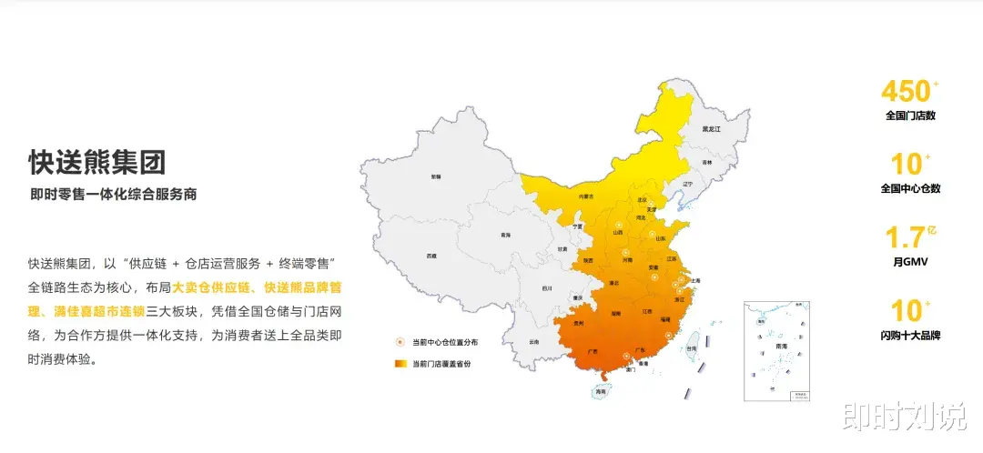 紧随其后的是第二梯队(500-1000家),这部分玩家不再盲目追求全国铺开,而是选择在一个区域“打深打透”。目前在仓店数量层面,这一段位的,仅有快送熊(满佳喜)一家,拥有500家门店,但更可怕的是其基建速度——坐拥10大中心仓,并计划今年达成12个。其布局横跨华东、华中、华北、华南,是目前最具全国扩张野心的品牌之一。而门店规模在 300-400 家的闪电仓品牌,属于行业竞争最激烈的中腰部红海梯队,涵盖快客达、优购哆、宅小熊、乐购达等主流品牌;这类品牌已完成核心区域深度布局并开启跨省份扩张,普遍搭建起中心仓 + 前置仓的成熟供应链体系,多数仍沿用动物元素强化辨识度,以精细化运营稳住单店效率与区域密度,在华中、华东、华南等重点区域具备较强竞争力,正处于冲击 500 家门店的关键阶段,是即时零售赛道中承上启下、兼具规模与成长性的中坚力量。3. 后起之秀:30-100家仓店门槛之争在 2026 年闪电仓品牌矩阵中,门店数在 100 家以下的仓店品牌呈现出 “区域深耕为主、全国试水为辅” 的鲜明特征,覆盖了从 12 家到 80 家不等的规模层级:其中 80 家门店的品牌有优家购物、时惠仓、便速优、速百易 4 家,70 家门店的品牌包括尚城购、嗨云购、易乐便利等 5 家,60 家及以下的品牌则更为分散,涉及能本便利店、宅家乐等多个主体。这些品牌的总部或核心布局地区广泛,涵盖长沙、深圳、重庆、西安、昆明、上海等多个城市,还有部分品牌无明确地域锚点;从区域覆盖来看,部分品牌聚焦湖南、山东、山西等单一省份,部分深耕川渝、西北、西南等区域,也有便速优、速百易等尝试全国布局,体现出 “小而美” 的区域化策略与 “小步快跑” 的扩张尝试并存的特点。在中心仓建设上,多数 100 家以下的仓店品牌未披露明确的中心仓布局,仅少数如畅益到家拥有 1.2 万平方米的中心仓,闪狗超市则采用 “中心仓 300 平 + 前置仓 30-50 平” 的轻量化模式,反映出中小品牌在供应链投入上更趋谨慎,更倾向于依托区域仓或前置仓实现高效配送,整体以灵活务实的策略在即时零售赛道中寻求差异化生存空间。