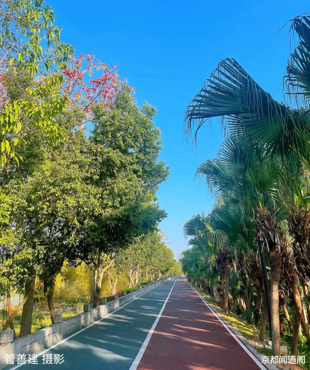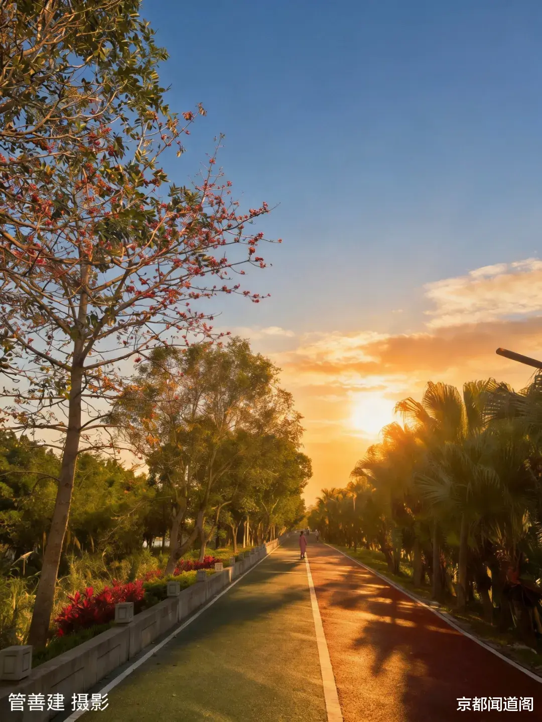 与妻子在绿道上徜徉。