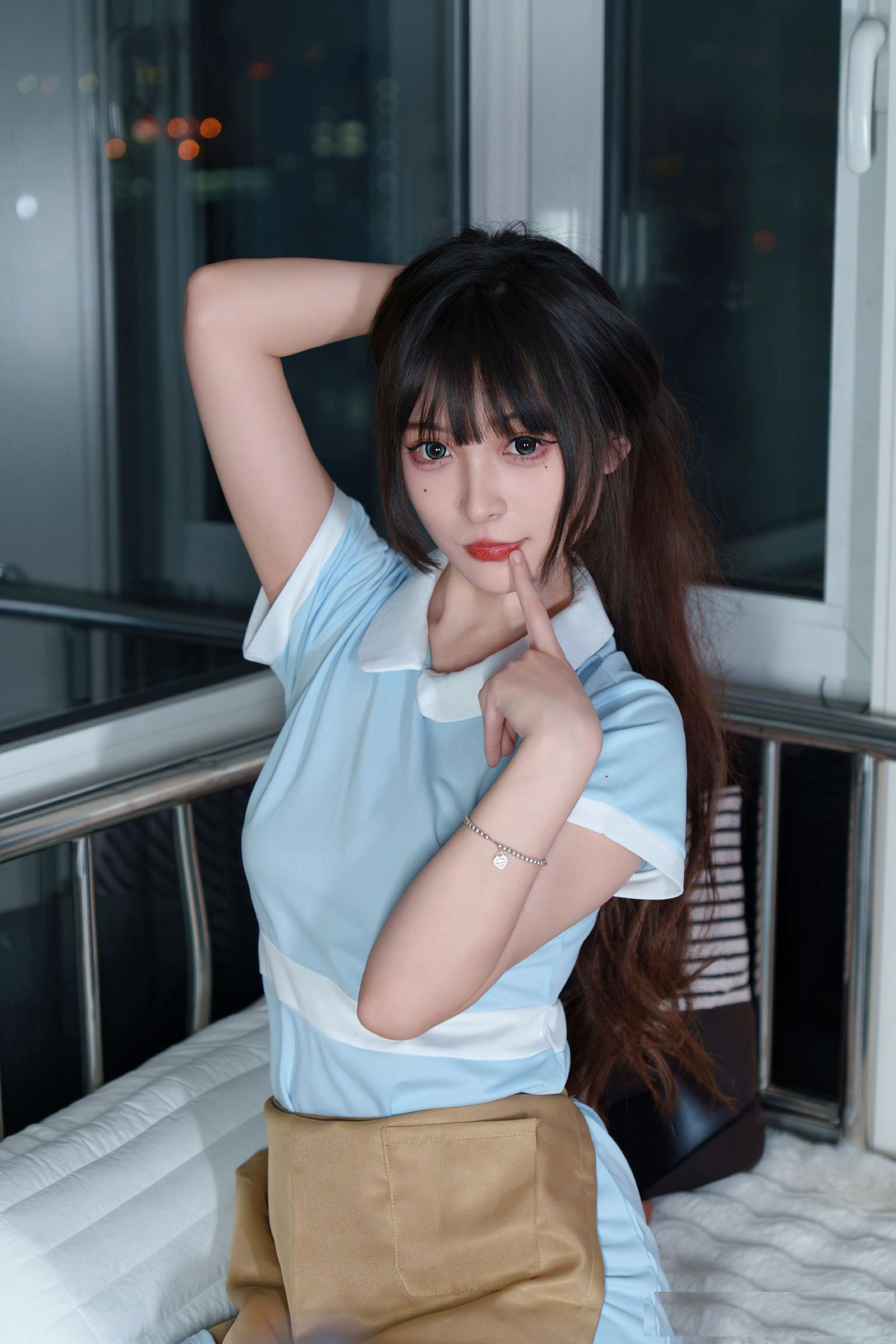 然而,她的脸上没有抱怨,只有一种平静的松弛。她看着镜头,笑容里带着一点下班后的倦意,也带着一份完成工作的踏实。这身蓝色制服,既是美丽的职业象征,也是一份实实在在的、需要用身体去承重的甜蜜负担。