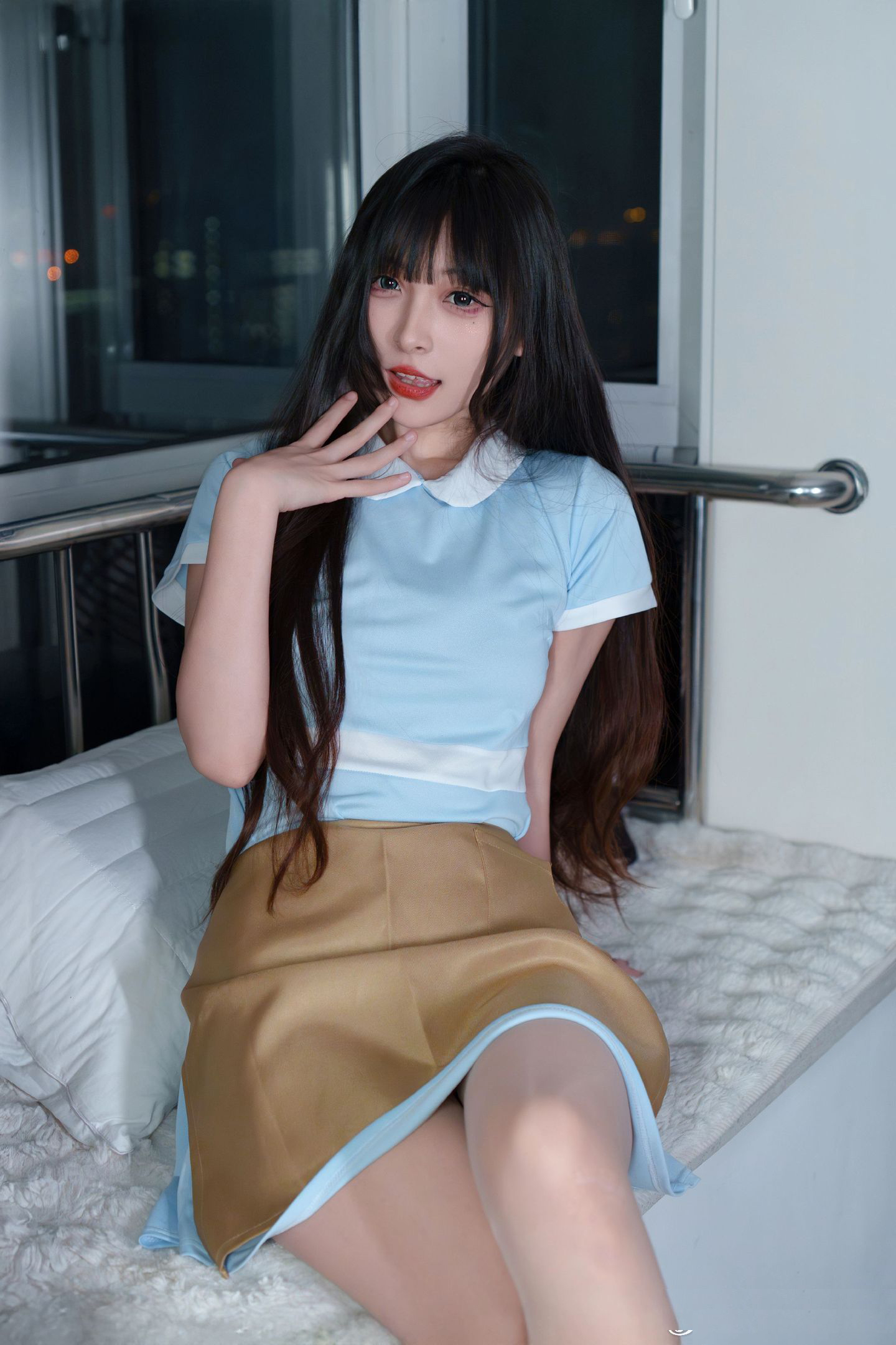 我找来一间干净明亮的房间,为她拍下这组写真。背景是简单的白墙,所有的焦点,便落在了她——和那身陪伴她站立了一整天的“好利来蓝”上。