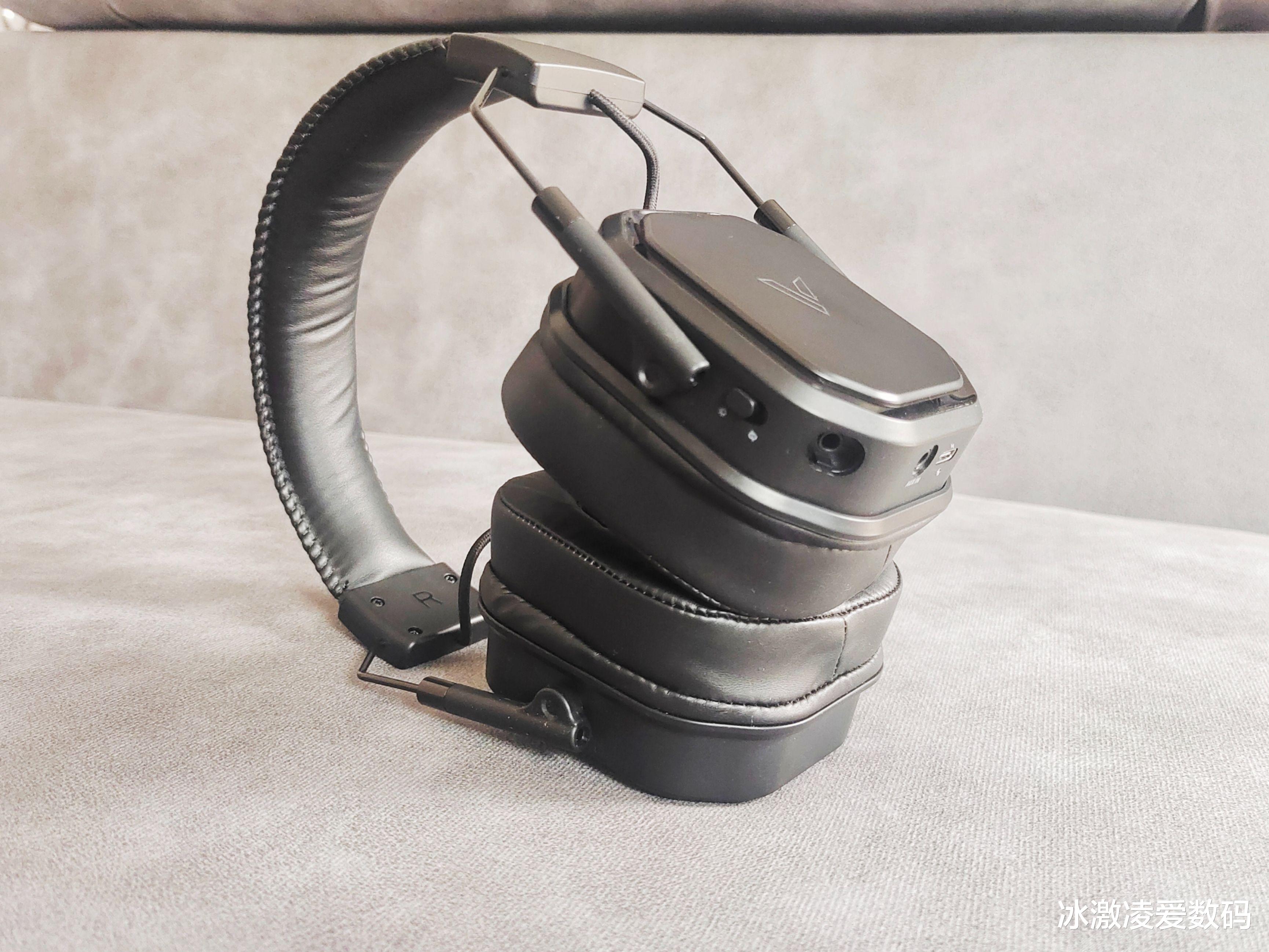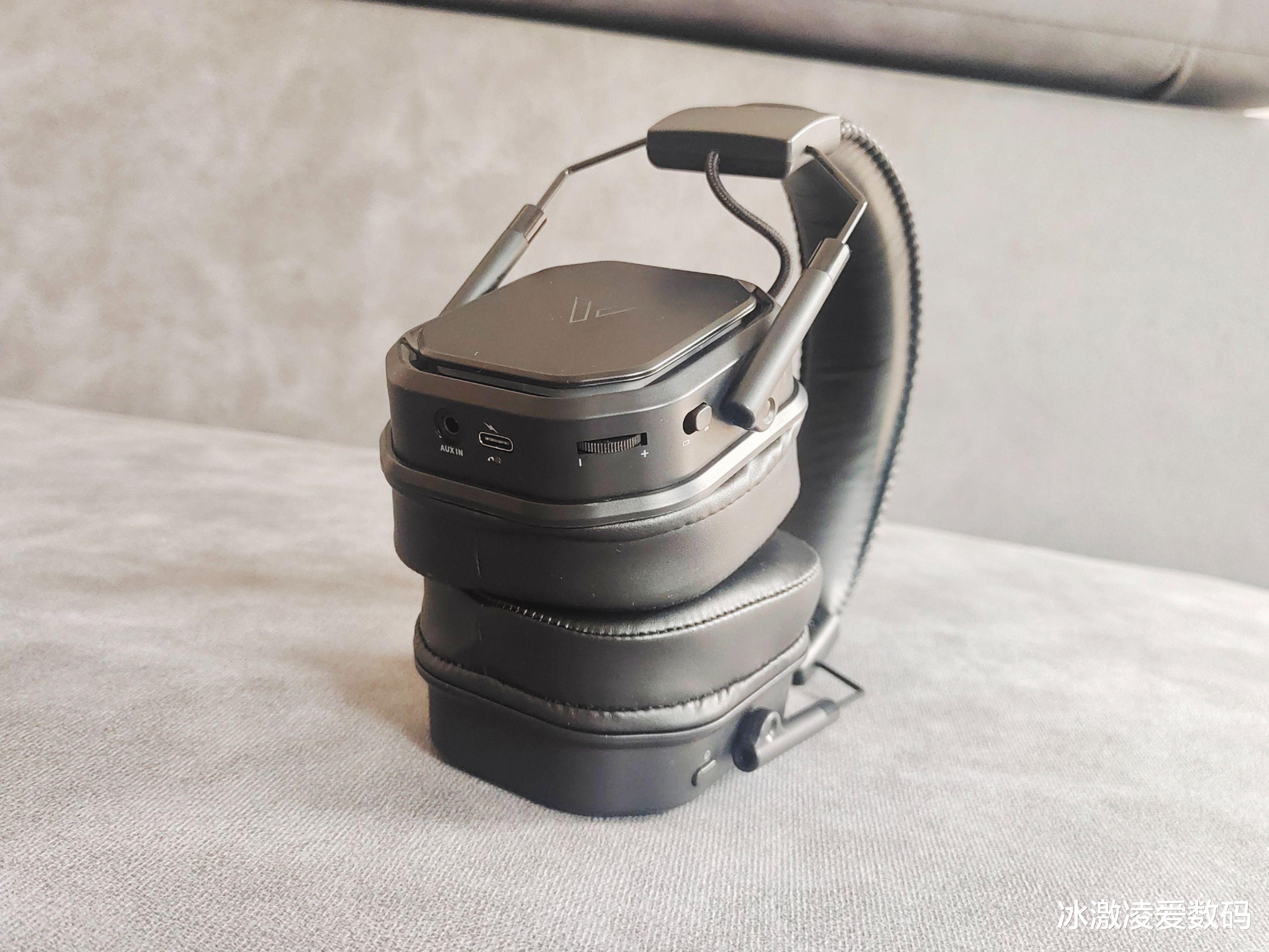 功能键的分布也不复杂,右耳耳机下方是开关机键。左耳是蓝牙和接收器切换键,耳麦及3.5mm线插和Type-C充电口,音量调节是滚动的齿轮设计,最左侧是蓝牙和接收器的转换按键。