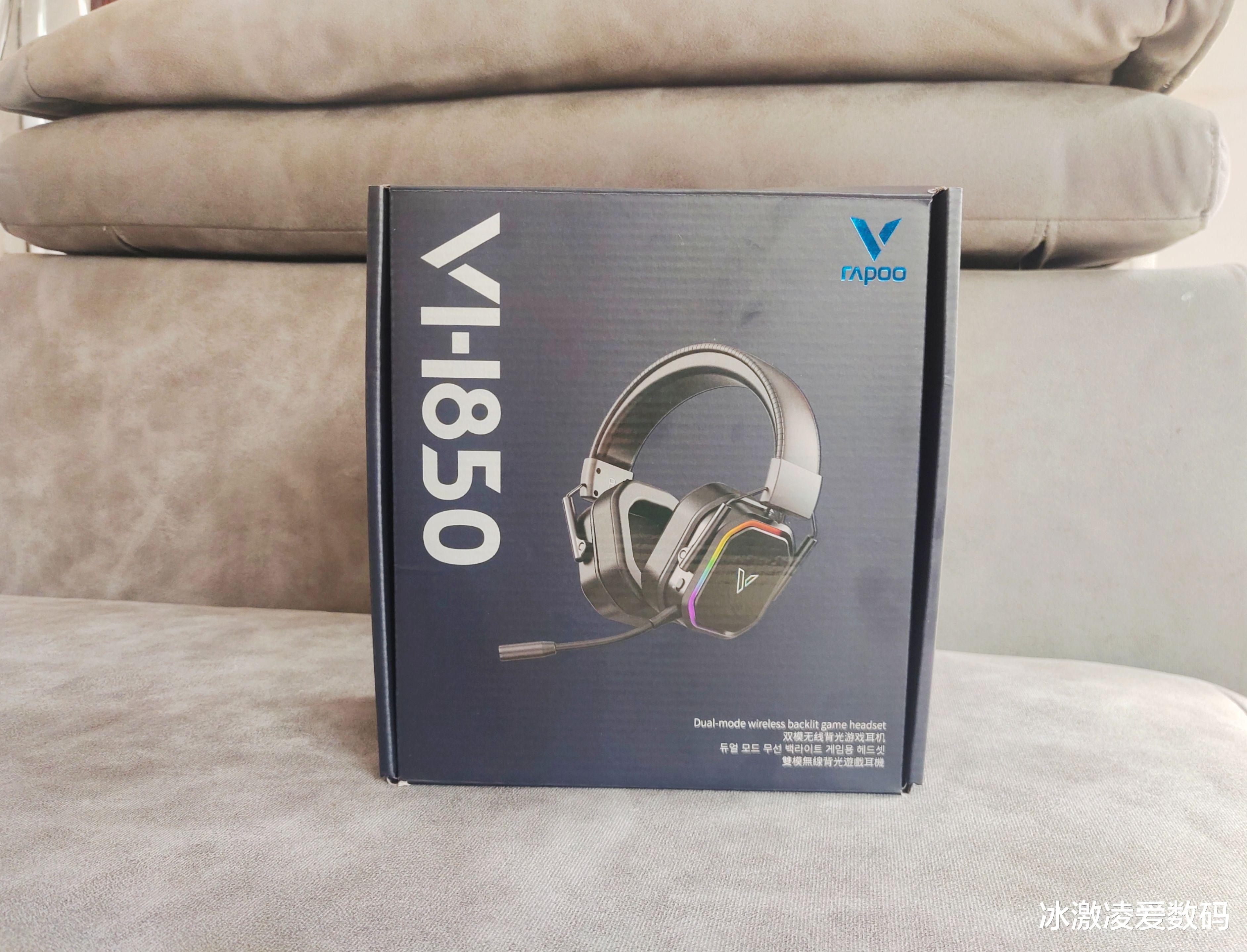 方方正正的黑色包装盒,正面左侧大大的白色字体写着“VH850”,右上方是雷柏品牌的logo图案。中间则是耳机的示意图。厂商把耳机用海绵隔板护得严严实实的,防护做得很周到。