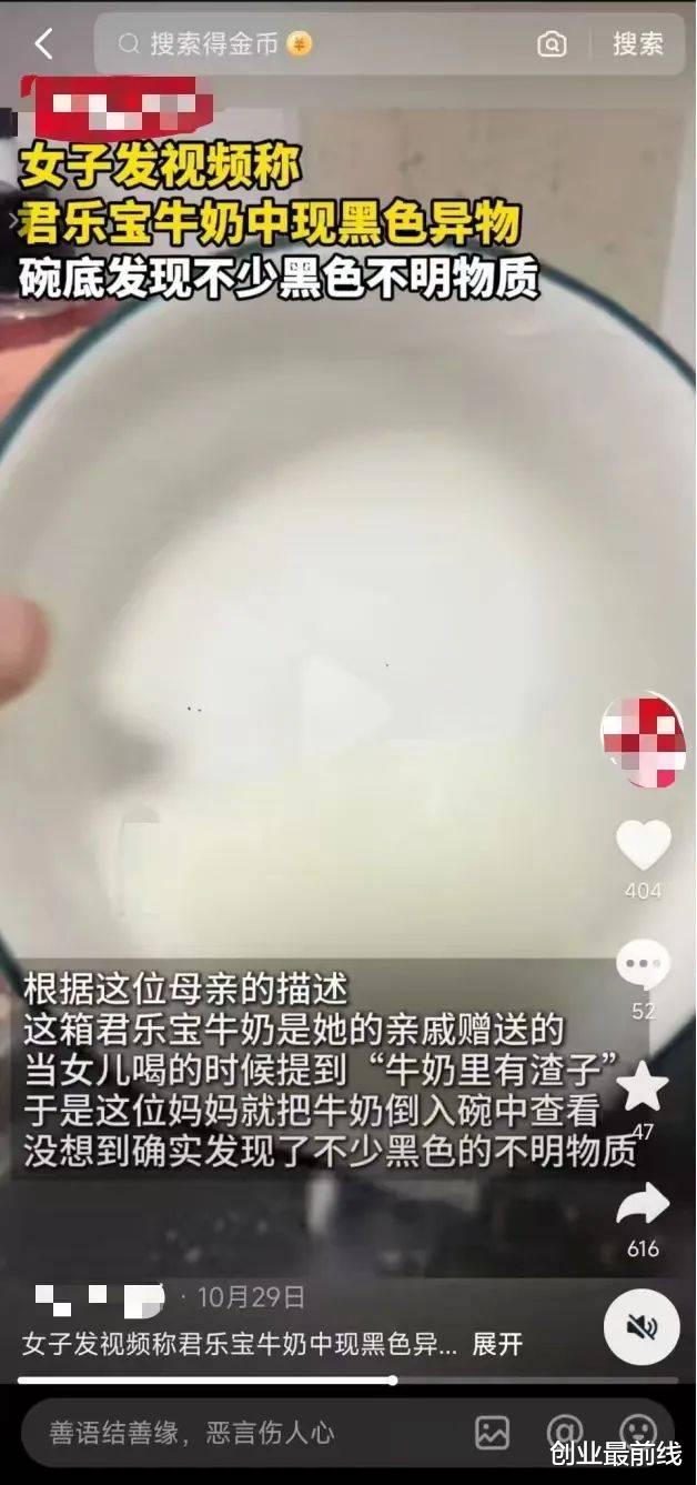 近日,网友在社交平台发布视频显示,君乐宝牛奶喝出黑色物质。君乐宝表示,公司在获悉情况后第一时间与消费者联系,积极与消费者进行沟通,并将批次留样产品送有资质的第三方机构进行检测,结果完全合格。