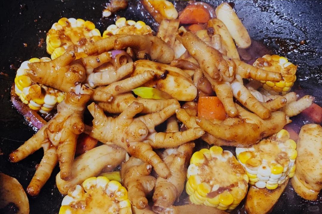 3、锅都不用洗,再往锅里多倒点油。油热了之后,把剩下的洋葱、大葱、蒜末倒进去,炒出香味来。这时候,把之前处理好的鸡爪、年糕、胡萝卜、玉米一股脑都倒进去,接着把调好的酱汁和那些干料也加进去,然后就开大火爆炒一会儿。