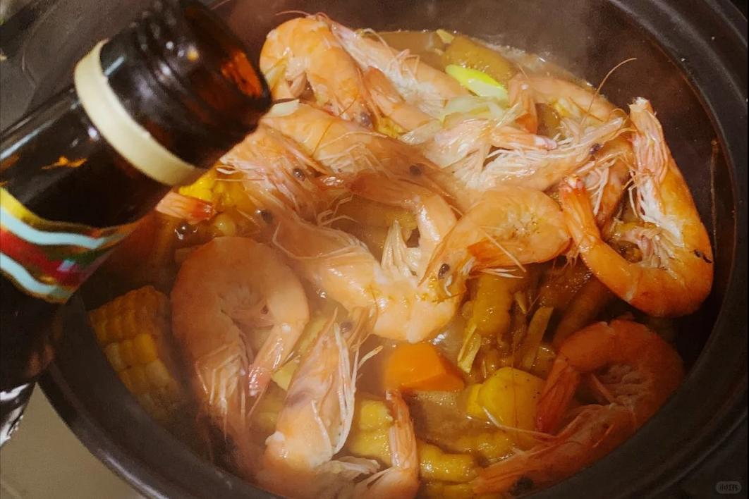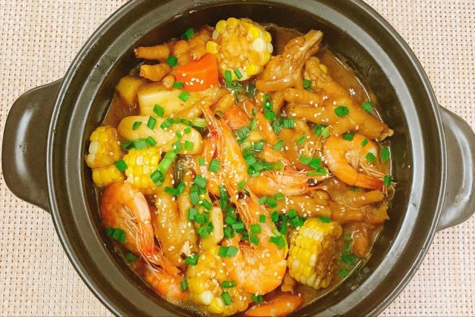 端上桌的时候,那香味直接扑鼻而来,鸡爪软糯得一嗦就脱骨,年糕吸满了汤汁,Q 弹又入味,虾也鲜嫩多汁,再配上清甜的胡萝卜和玉米,每一口都是满满的幸福感。