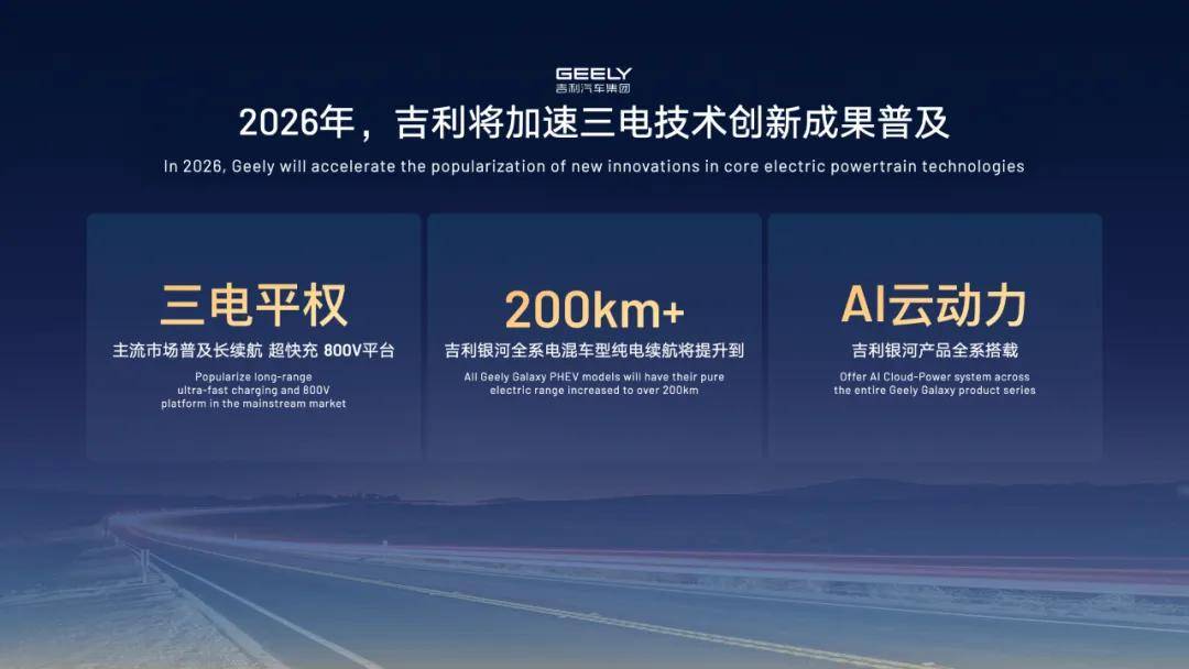 在电池领域,2026年,吉利神盾金砖电池将推出全新磷酸锰铁锂材料体系,电池能量密度有望进一步提升15%以上。吉利的全固态电池也将在今年完成首个Pack下线和装车验证,并推动长续航、超快充及800V平辆加速进入主流市场。今年,吉利银河全系电混车型纯电续航将提升至200km以上,且全部搭载AI云动力,让用户越开越省。