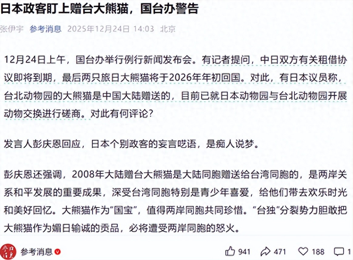 而这些日本政客,却不是想办法去挽回当前的局面,更是将“如意算盘”直接打在了台湾大熊猫的身上。