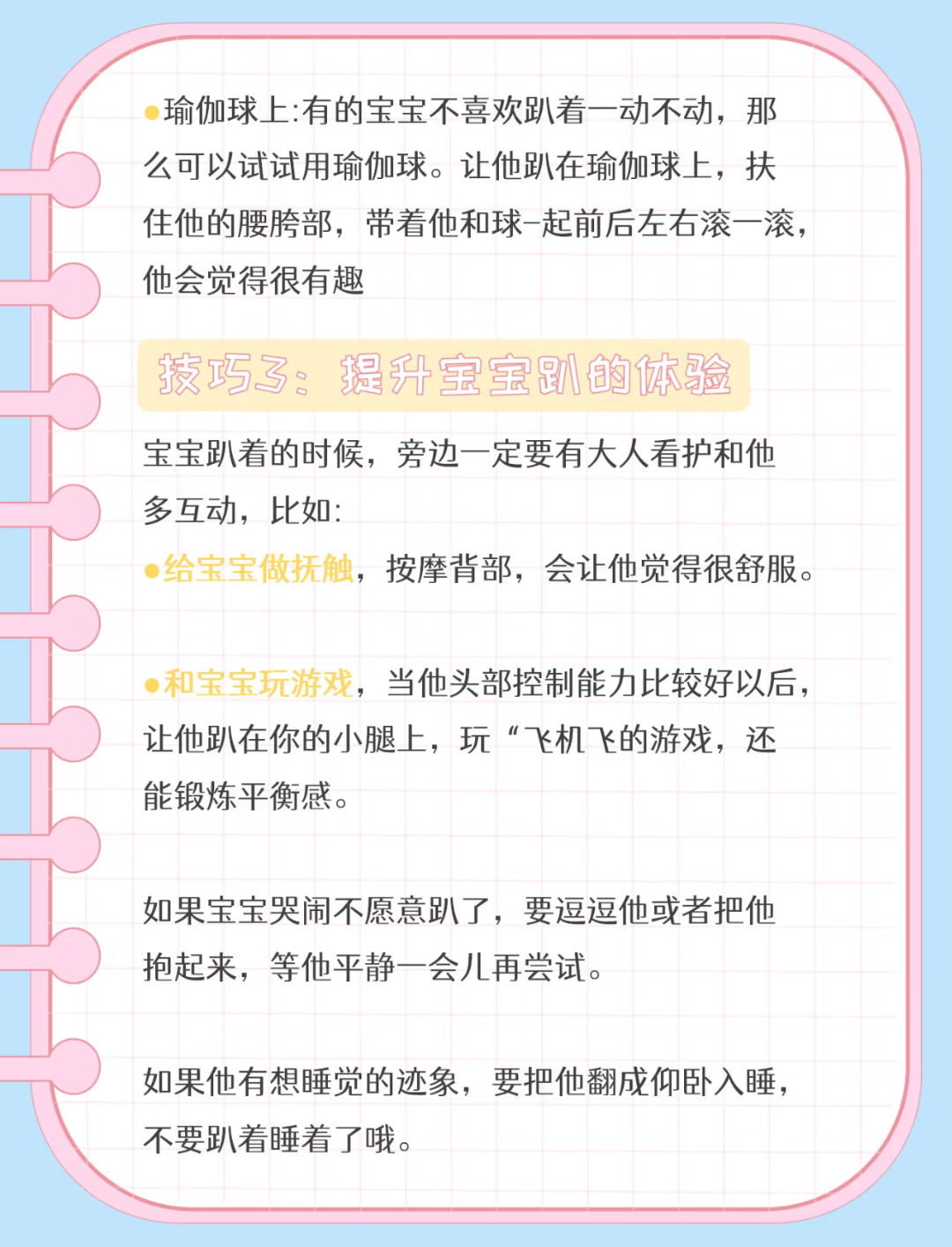 选择一个柔软又舒服的地方,能让宝宝更享受趴着的时刻。很多宝宝喜欢趴在爸爸妈妈的腿上、胸前或肚子上,这样亲密的身体接触会给他带来安全感,也能听到你熟悉的心跳声。如果是在平坦的游戏垫或床上,可以在他面前放一些色彩鲜艳、会发出轻柔声响的小玩具,轻轻对他说话、唱歌,吸引他的注意力。有的宝宝天性活泼,不喜欢静趴不动,这时可以尝试让他趴在瑜伽球上。扶稳他的腰和臀部,带着球慢慢前后左右轻轻滚动,这种动态的起伏会让宝宝觉得像在游戏,自然乐在其中。