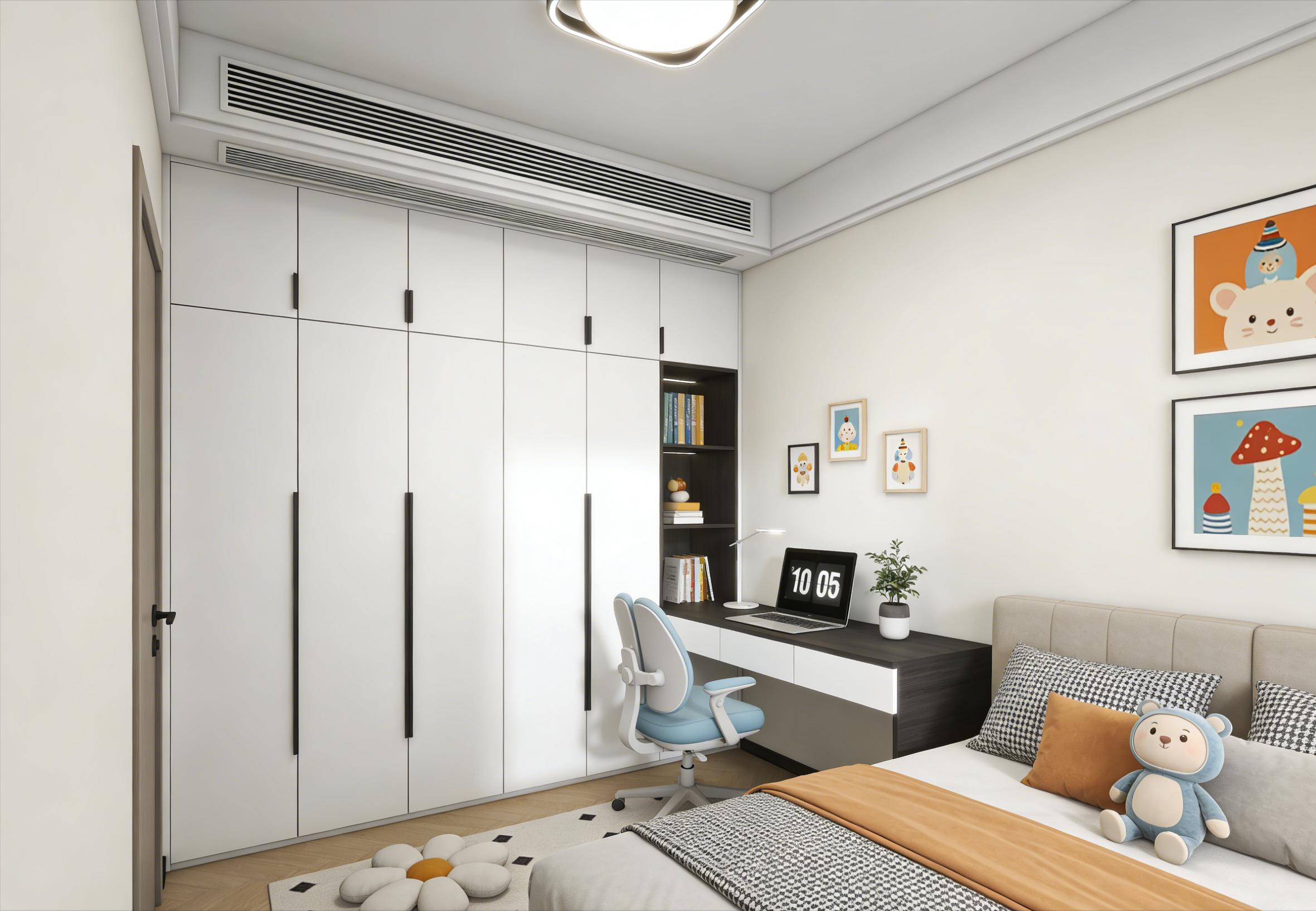 儿童房柜体以白为主、黑调点睛,衣柜书桌一体化设计超实用!呼应全屋风格,学习需求拉满,空间精致度直接拉满~