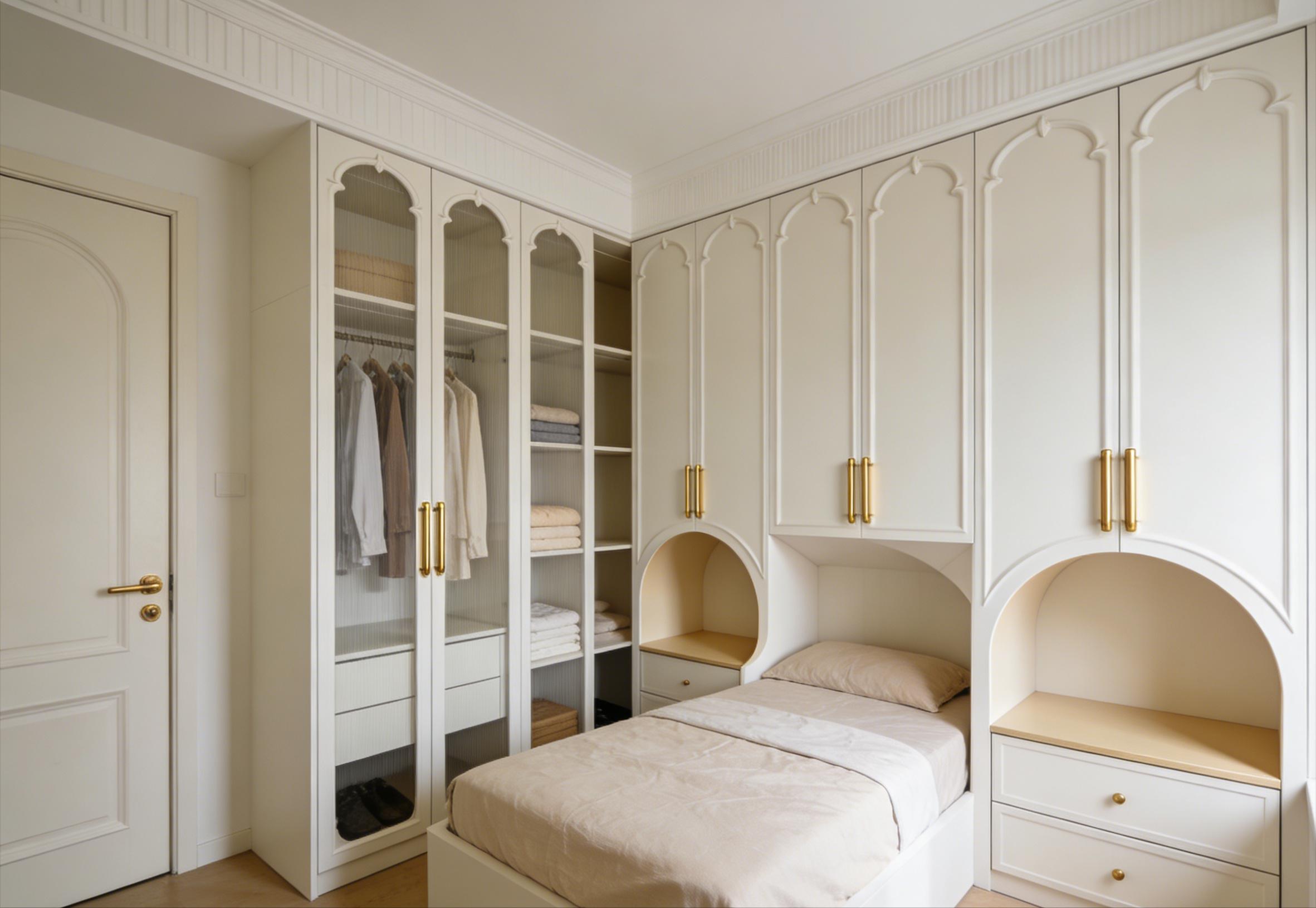 主卧衣柜沿床头墙面定制通顶柜体,柜门为骨骼门造型,搭配内嵌式金色拉手,与房门风格统一。设计师巧妙利用户型凹角,将床嵌入衣柜中间,两侧预留半圆置物区替代传统床头柜,既节省空间,又让床头区域更具呼吸感。衣柜内部划分挂衣区、叠放区与被褥区,满足衣物分类收纳需求,骨骼门的简洁造型也让主卧视觉更整洁。