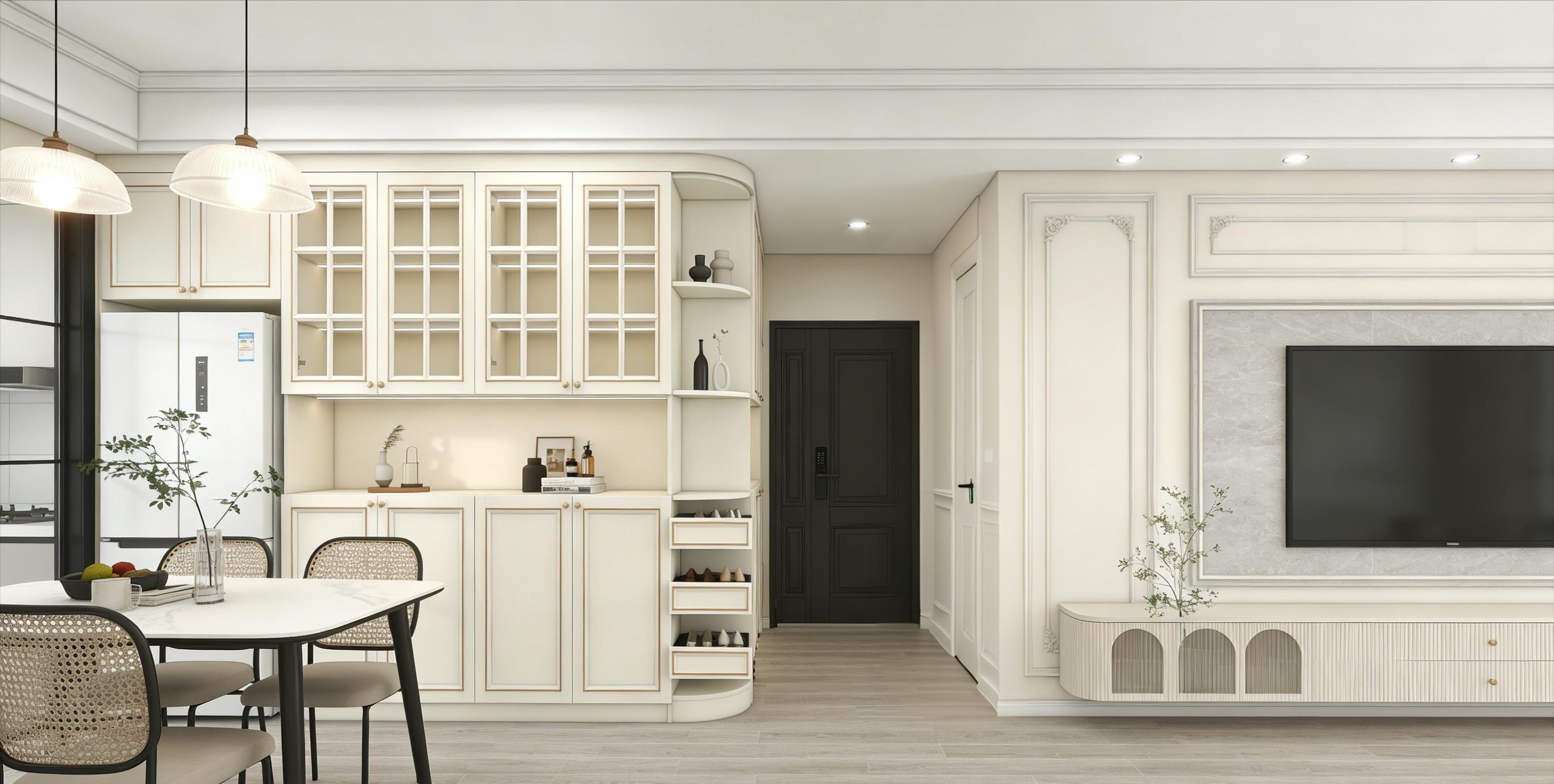 原户型玄关空间狭窄,无独立收纳区域,设计师通过墙体微调,打造L型转角鞋柜+餐边柜一体结构,柜门全部采用法式骨骼门设计。选用奶油白混油骨骼门,形成简洁的“田字格”造型,既保留法式对称美,又因线条纤细而不显厚重。
