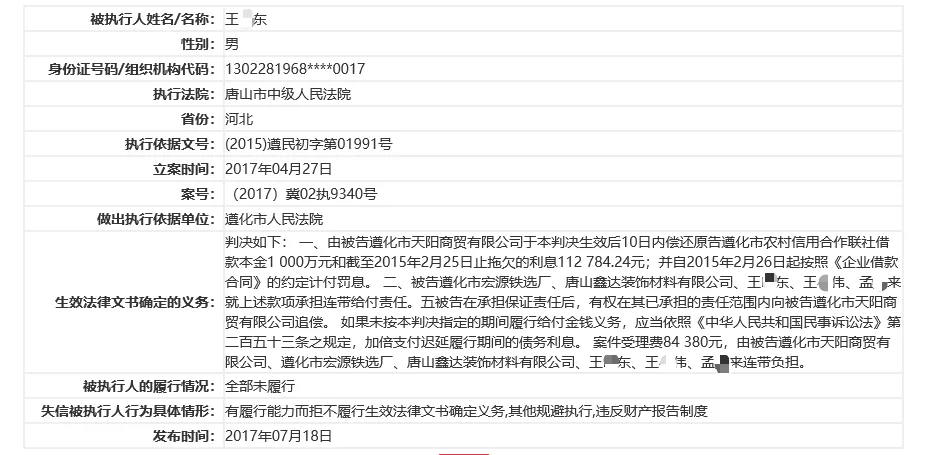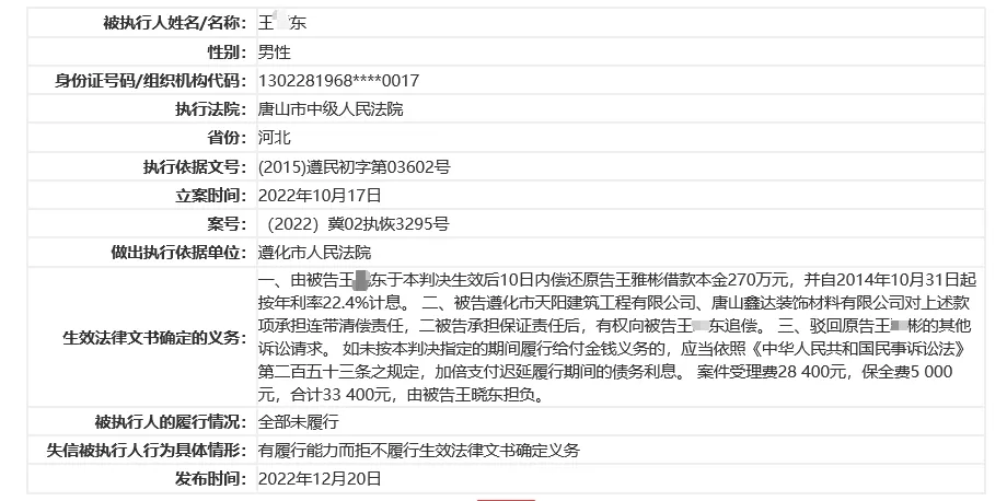 据中国执行信息公开网提供的信息显示,鑫达装饰及法定代表人王某东24次被限制高消费,涉案总金额1213.29 万元。而王晓东2次被唐山市中级人民法院列入失信被执行人,涉案总金额1281.28 万元,失信被执行人行为具体情形为“有履行能力而拒不履行生效法律文书确定义务”以及“有履行能力而拒不履行生效法律文书确定义务,其他规避执行,违反财产报告制度”。