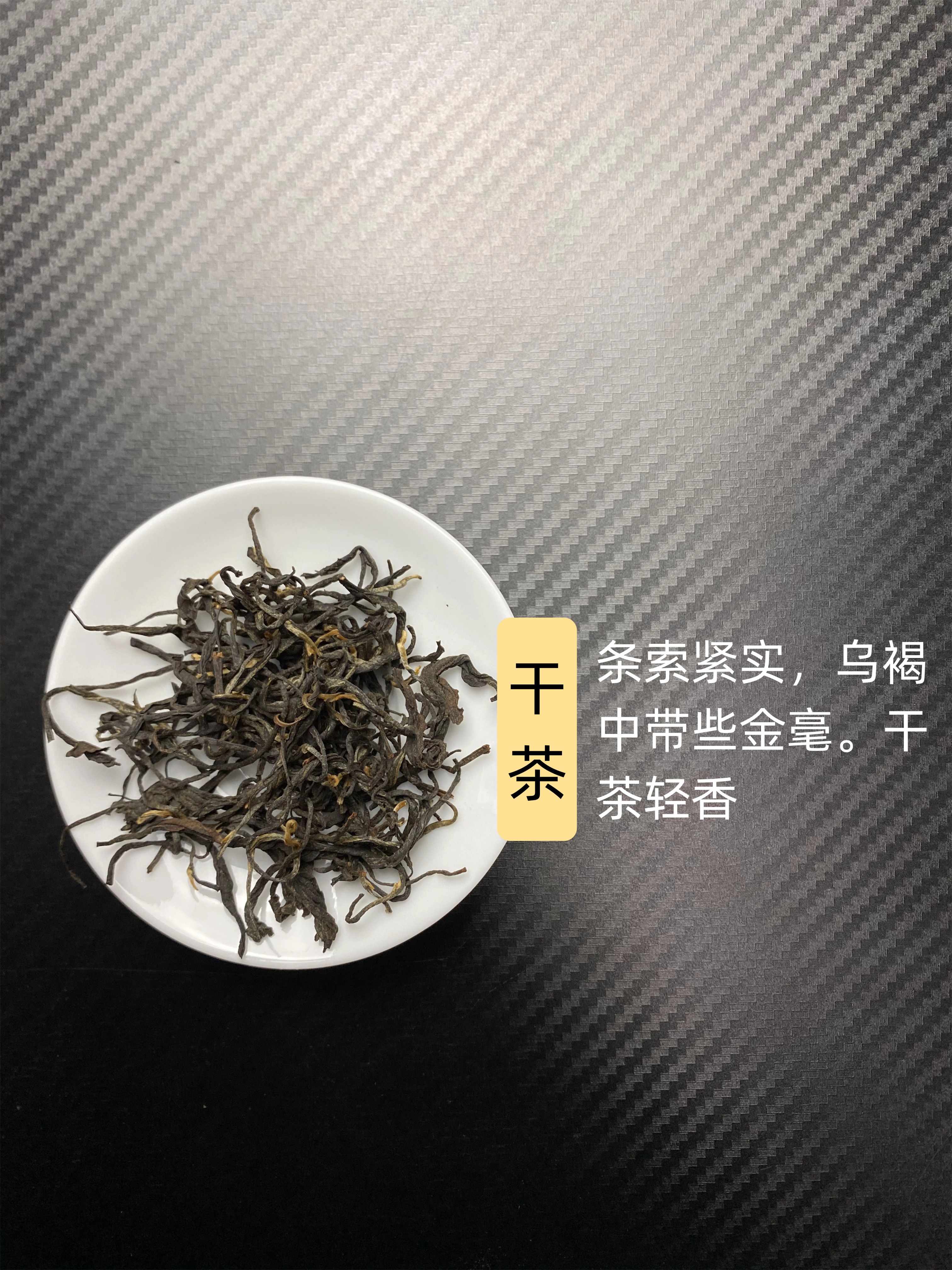 干茶:条索紧实,乌褐中带些金毫。干茶轻香