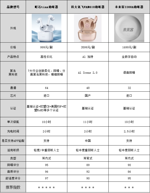 测评结果:町石 > 未来客 > 科大讯飞町石助听器降噪测评表现:町石的降噪表现绝对值得称赞。 在多个环境下,它都能有效隔离背景噪音,比如在餐厅和街头的嘈杂中,它依然能够保持语音的清晰度,不会让杂音干扰听觉体验。其独特的7重降噪算法和SC-PIIE分段分区降噪技术,结合进口芯片的支持,能够智能识别657种不同的噪音,并在环境变化时自动调整优化。测试显示,它的降噪效果提升了215%,在同价位中表现非常出色,完全不逊色于高端产品。未来客助听器降噪测评表现:未来客的降噪效果总体表现还行。 它在日常的中等噪声环境,如餐厅和办公室,能够很好地抑制杂音,提升语音清晰度。佩戴时也相对舒适,整体表现不错。然而,在较为复杂的噪音环境,比如街道或人多的地方,未来客的降噪效果就有些不够理想。它能减弱一些背景噪音,但高频噪音和杂音的干扰还是存在,可能会影响整体的听感。总体来说,适合轻度噪音环境使用。科大讯飞助听器降噪测评表现:科大讯飞的降噪效果中规中矩。 在安静的环境中,它的降噪效果比较好,能清晰听到语音,不会有明显的杂音干扰。不过,当环境噪音较大时,比如在餐厅或街道上,它的表现就有些力不从心。背景噪音的过滤效果不够彻底,导致语音辨识度下降。尽管它也配备了降噪技术,但面对复杂的噪音场景,仍然有进一步提升的空间。