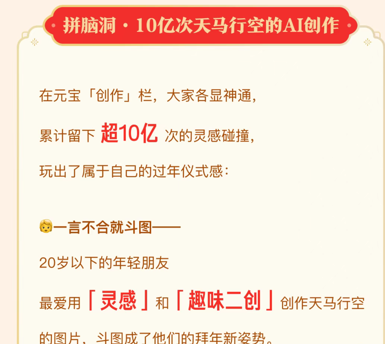 本次活动依托微信生态与AI互动设计,腾讯元宝为用户提供了全面,且富有节日趣味的互动体验,成为春节AI应用场景的重要实践。