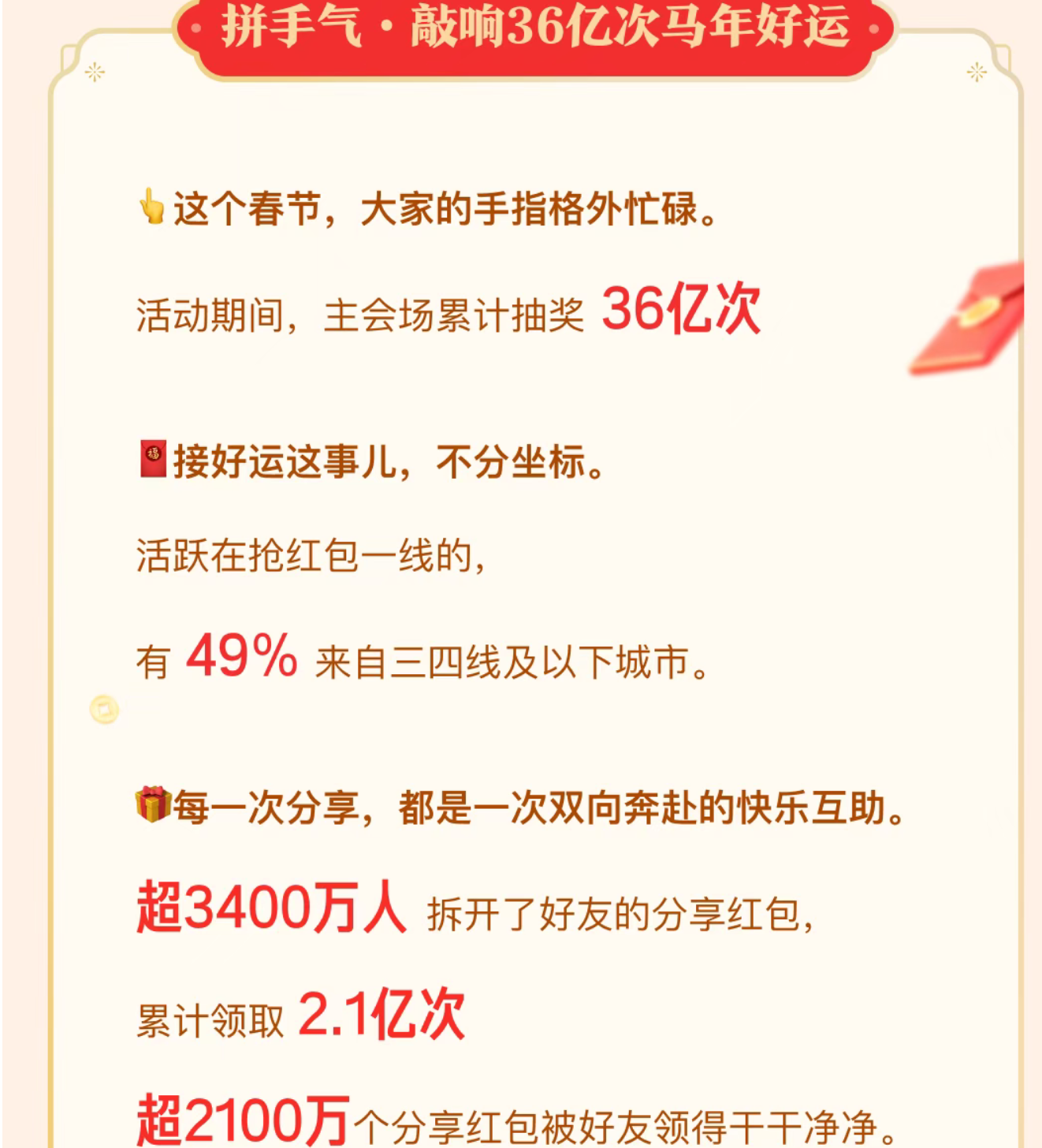 此外,活动期间超3400万人领取了好友分享红包,累计领取次数达2.1亿次。