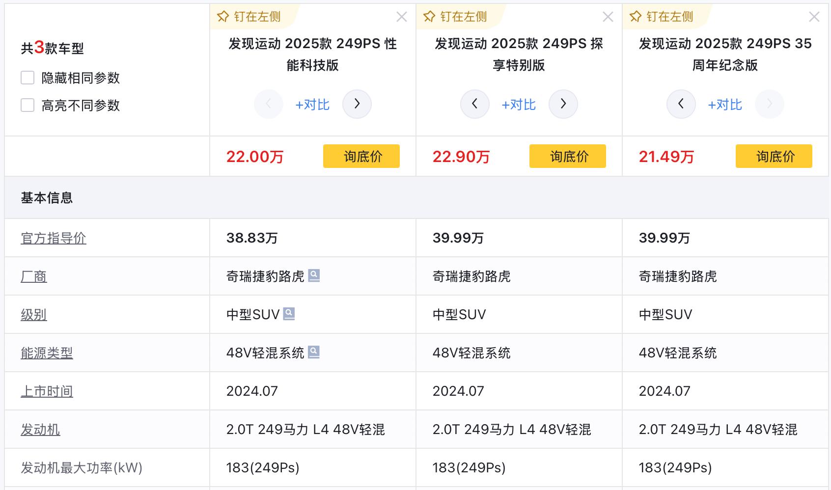 目前路虎发现运动共有三款车型在售,均为2025款,指导价38.83-39.99万元,我们来看一下具体车型之间的配置差异: