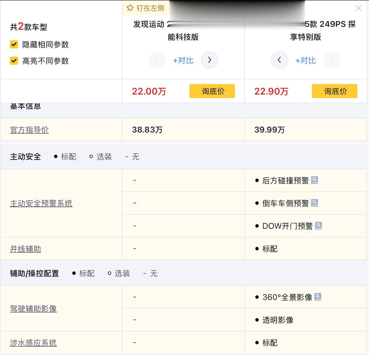 首先来看性能科技版和探享特别版,指导价38.83万元和39.99万元,相差1.15万元,配置上,后者多了后方碰撞预警、倒车车侧预警、DOW开门预警、并线辅助、360全景影像、透明影像、涉水感应系统、4个车外摄像头和4个超声波雷达等功能和配置。个人觉得,这些配置的升级还是能接受的,在主动安全方面有所提升,并且360影像这些功能也很实用。