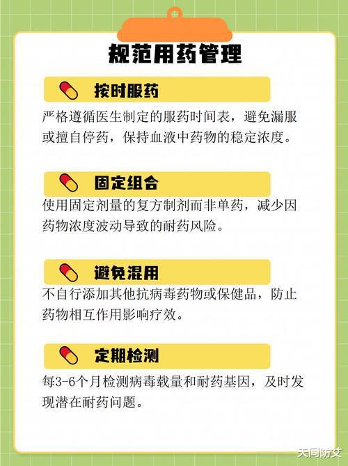 定期复查,早发现早干预每 3-6 个月必须做 1 次病毒载量检测,这是发现早期耐药最准、最快的办法。