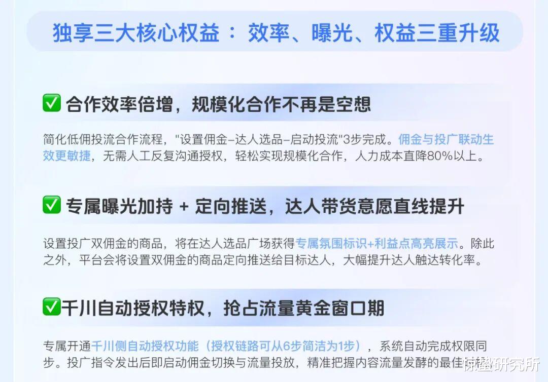 从精选联盟联动千川落地“双佣金功能”,到“千川・乘方”智能营销产品的全新发布——这些举措不是零散的尝试,而是一套环环相扣的“减负增收”方案。