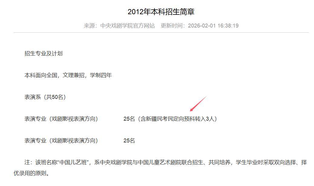 但风波并未就此平息,因为网友们搜出2012年中戏的本科招生简章一看,发现明明白纸黑字写着“含xin疆预科转入3人”,也就是有三位学生是从xin疆预科班,转入了普通本科班。据资料显示,录取分数只需152分——北京考生是284分。