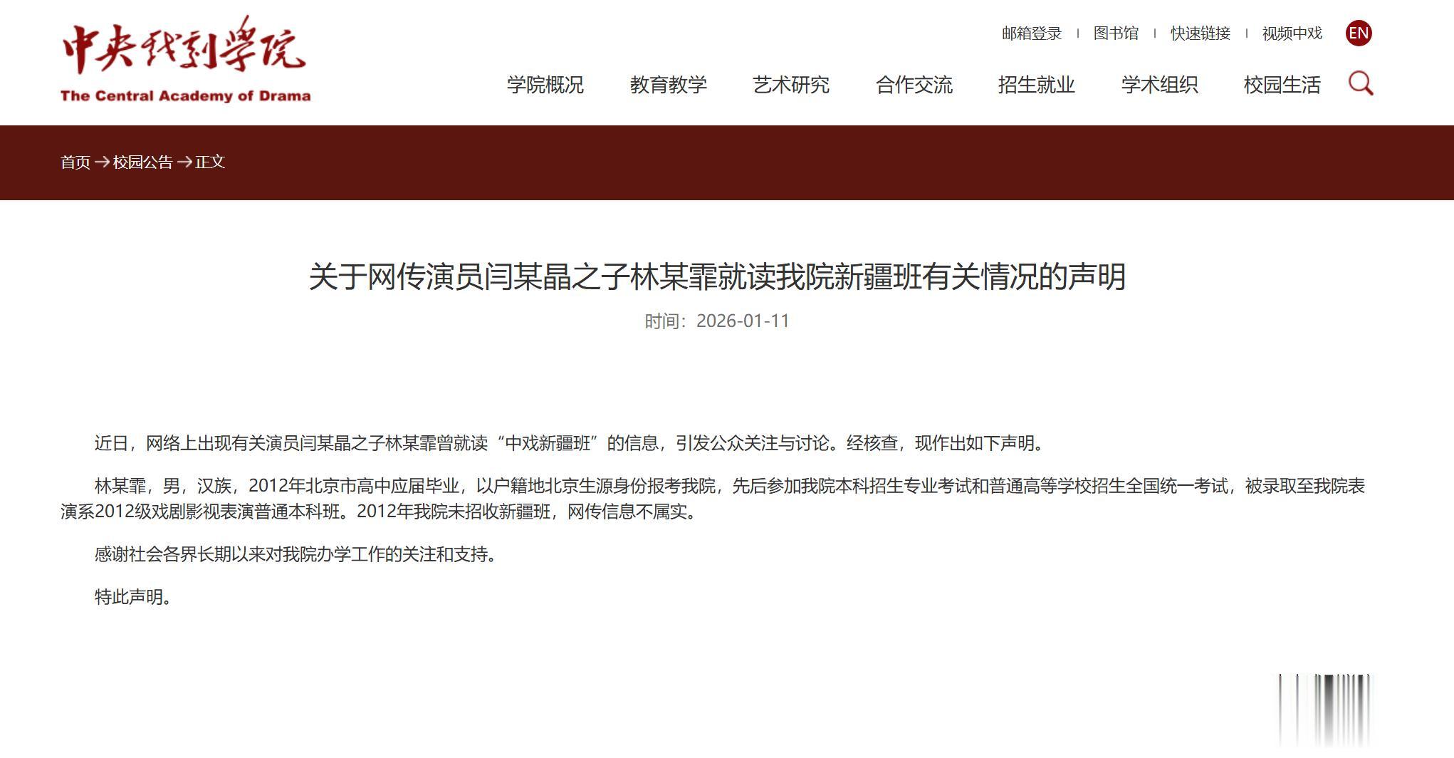 中戏专门为此发布了情况声明,称林傲霏是以北京生源的身份报考,录取的是普通本科班,且2012年中戏并没有招收“xin疆班”。