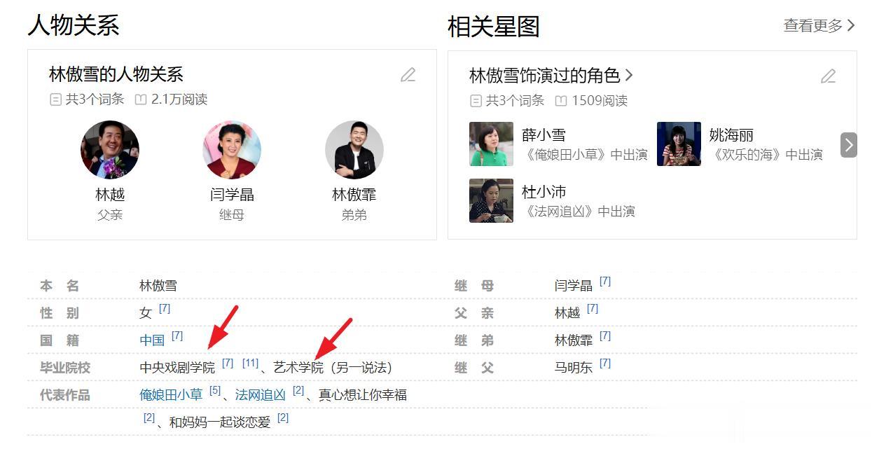 继女林傲雪,原本资料写着毕业于中央戏剧学院表演系 ,闫学晶“翻车”后,她的毕业院校又多了个“艺术学院”,来了一出此地无银三百两。