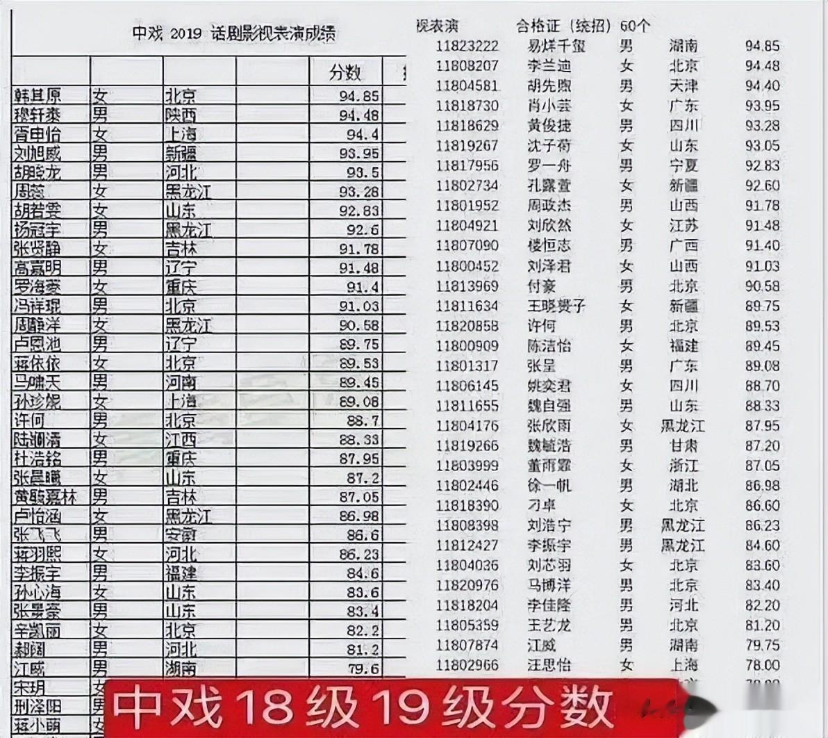更离谱的是,还有网友发现2018年和2019年的中戏表演成绩单,居然是一模一样的,精确到小数点后两位。