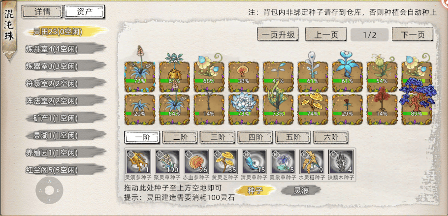种植:前期灵谷 + 聚灵草,后期月光草 + 火灵芝(高价高收益)。